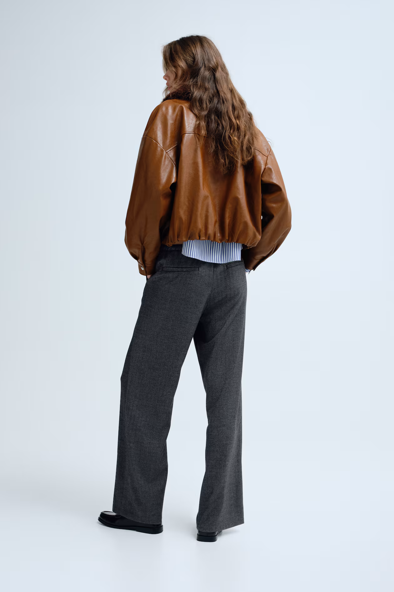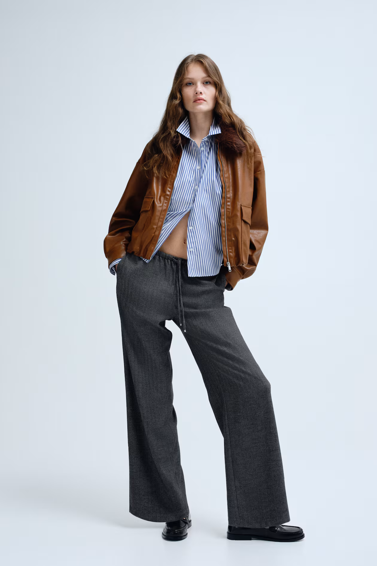 Loose-fit pants in herringbone-weave fabric. Elasticized, drawstring waistband, discreet side pockets, and mock welt back pockets. Straight legs.