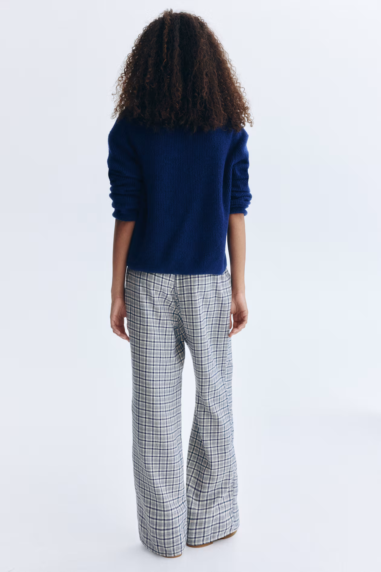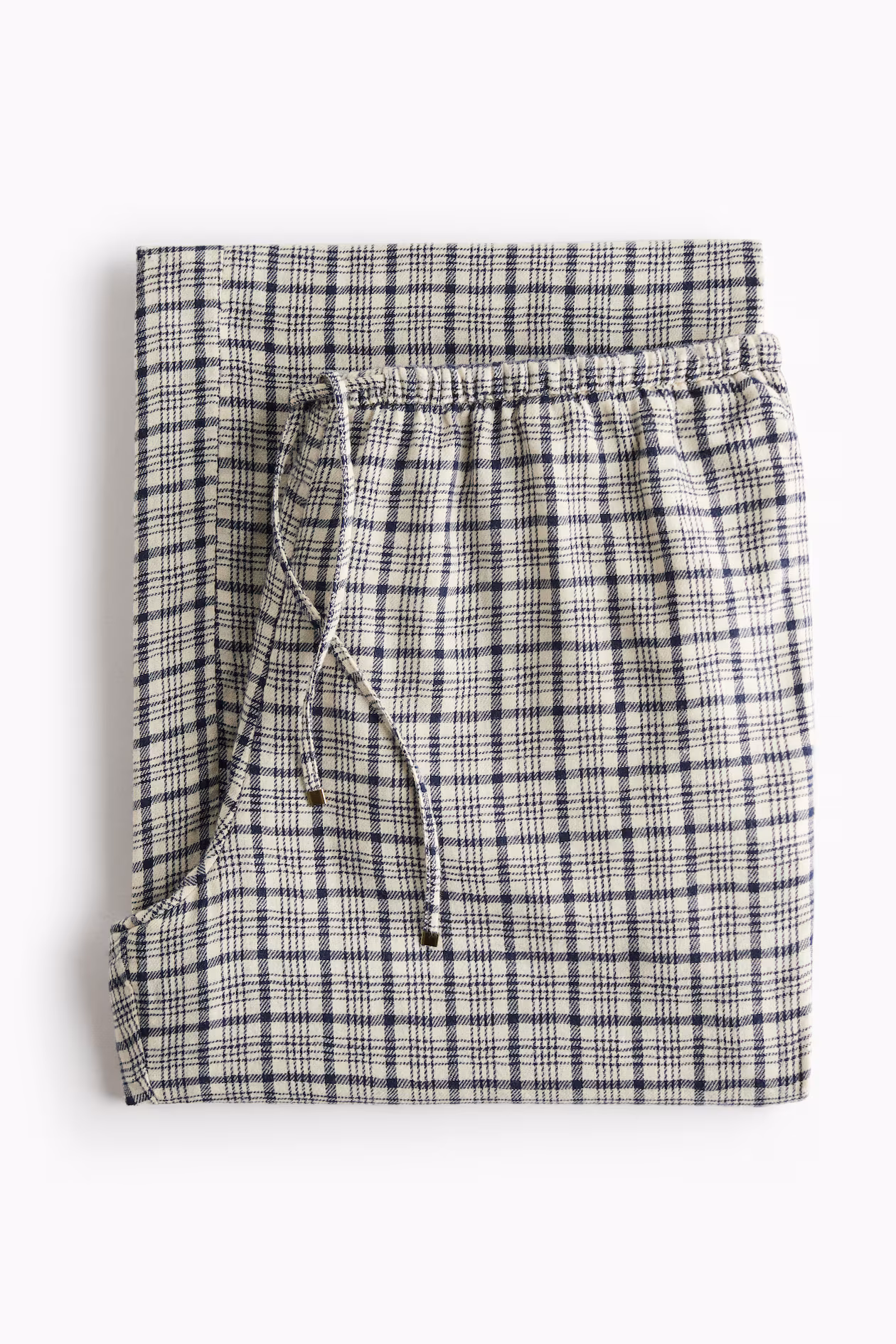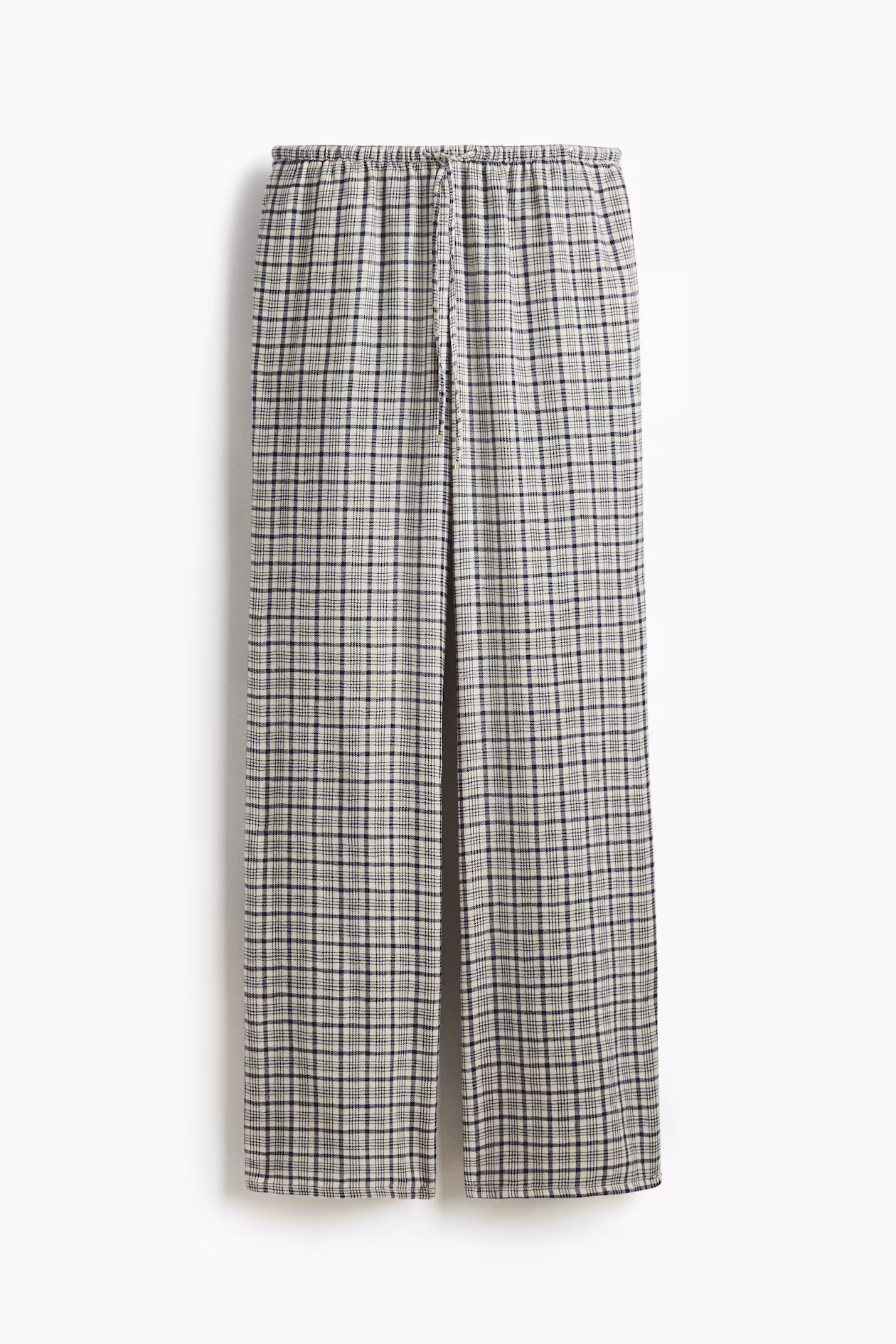 Pants in soft woven fabric. Elasticized, drawstring waistband, discreet side pockets, and straight legs.