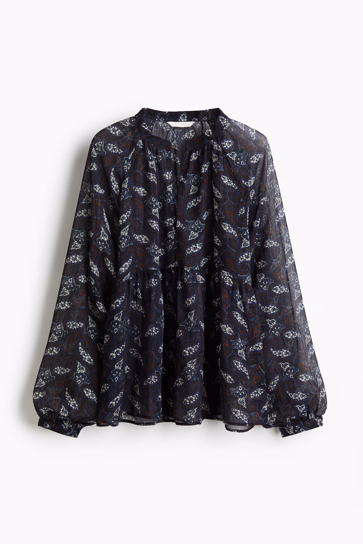 Oversized blouse in sheer, patterned chiffon. Gathered band collar, V-shaped opening at front, long balloon sleeves, narrow cuffs with button. Gathered seam at front of waist for added volume.