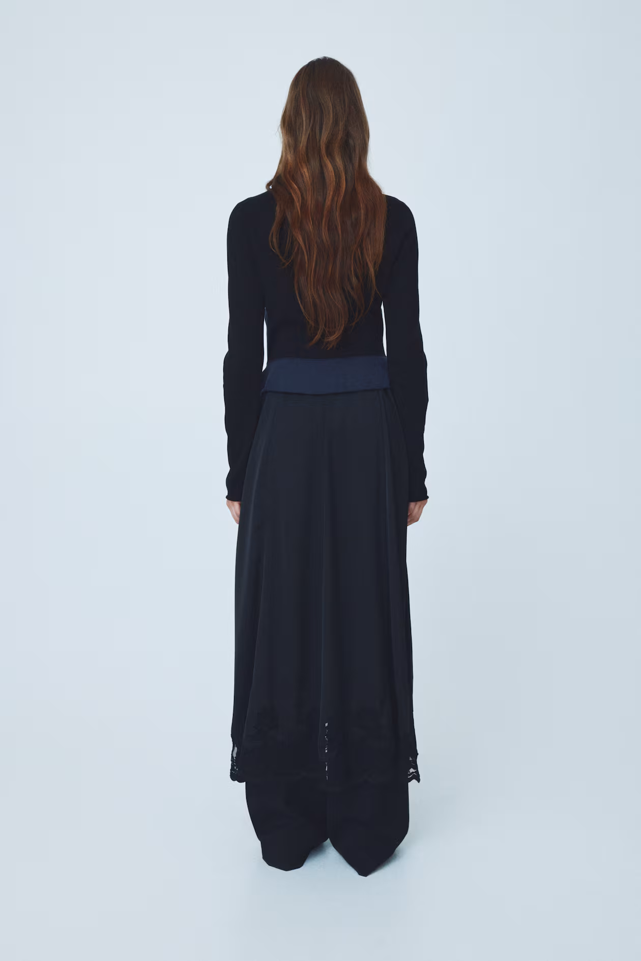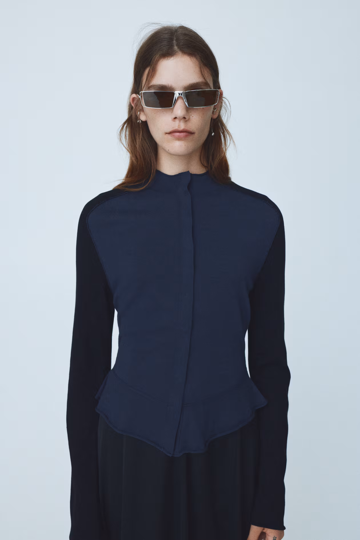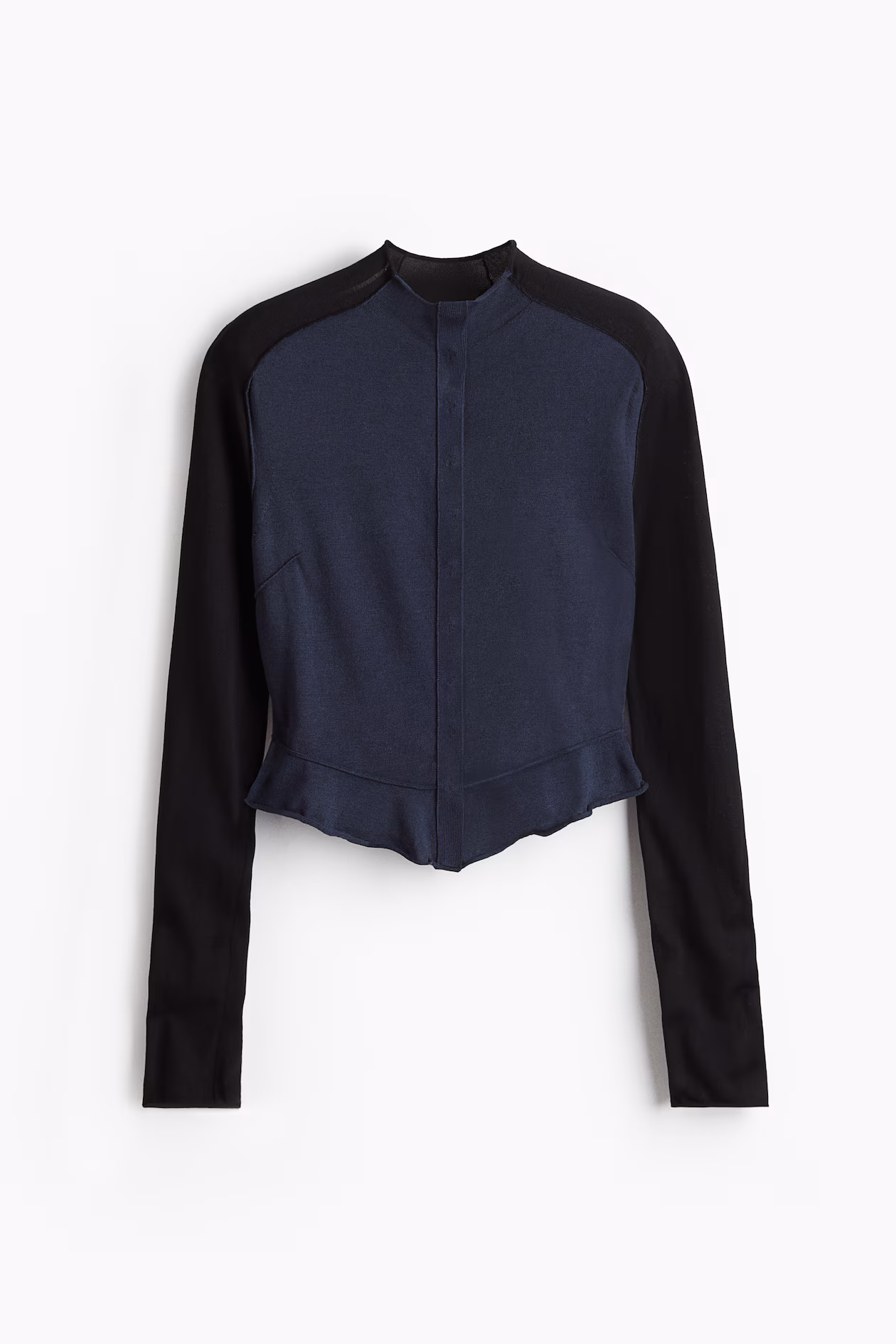 Fitted, two-tone cardigan in a soft, fine knit made from a cotton and lyocell blend. Stand-up collar, placket at front with concealed snap fasteners, and visible darts at bust. Defined shoulders with fully fashioned sections and extra-long saddle sleeves. Darts at back of waist and a flared peplum. Rolled edges.