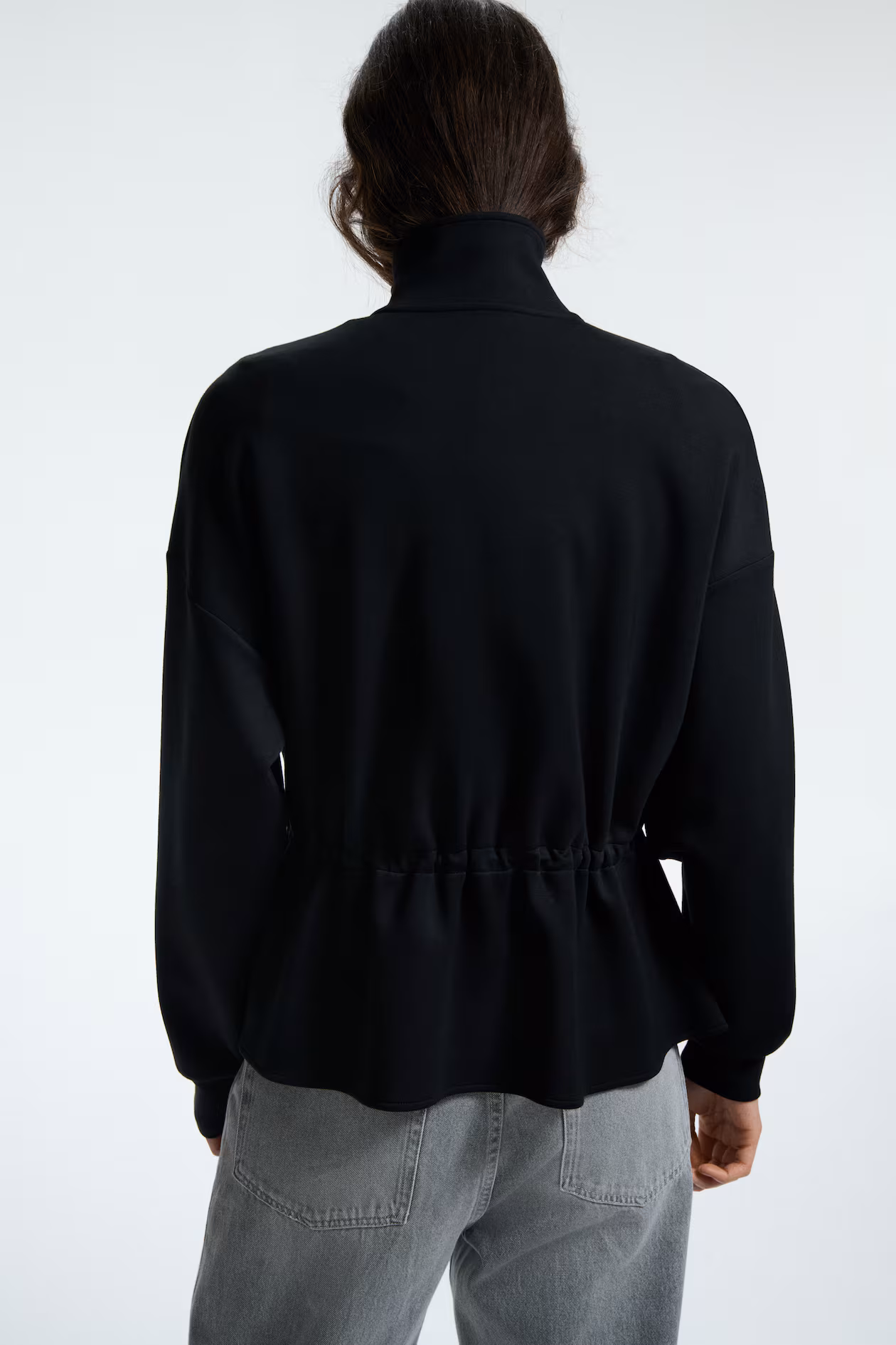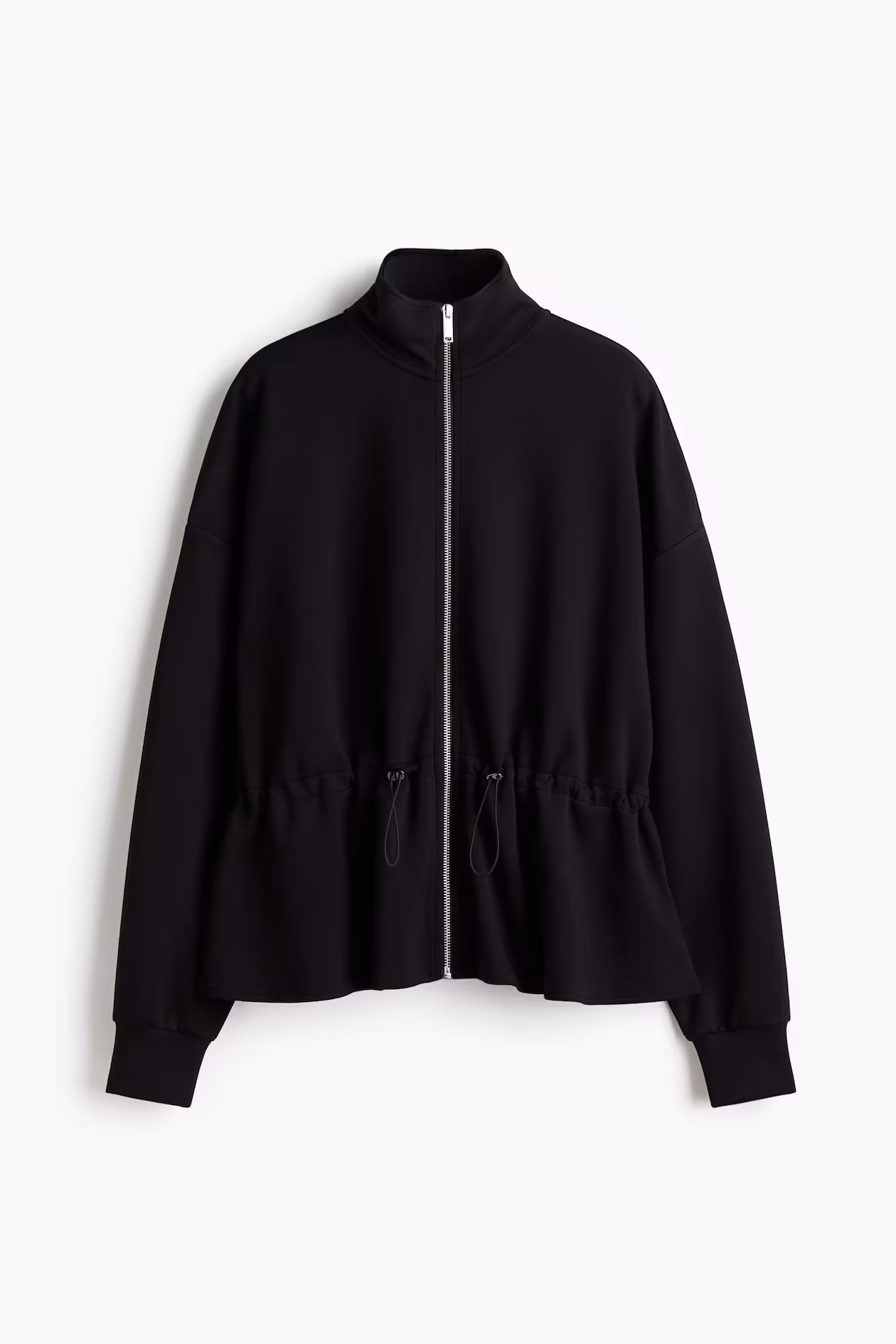 Oversized sweatshirt jacket in thick jersey. Stand-up collar, zipper at front, dropped shoulders, and long sleeves with ribbed cuffs. Elasticized drawstring at waist with cord stoppers creates a flared peplum.