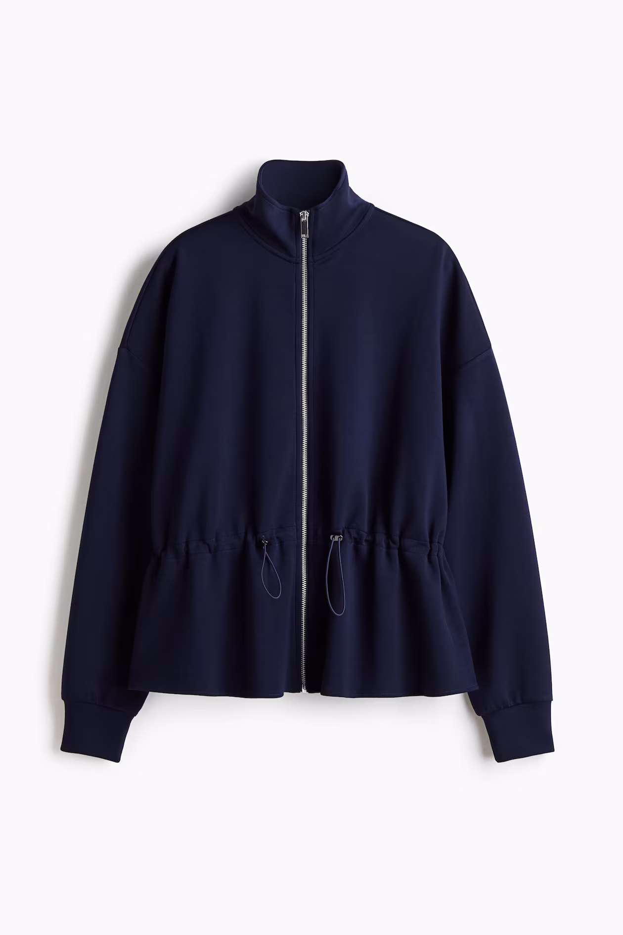 Oversized sweatshirt jacket in thick jersey. Stand-up collar, zipper at front, dropped shoulders, and long sleeves with ribbed cuffs. Elasticized drawstring at waist with cord stoppers creates a flared peplum.
