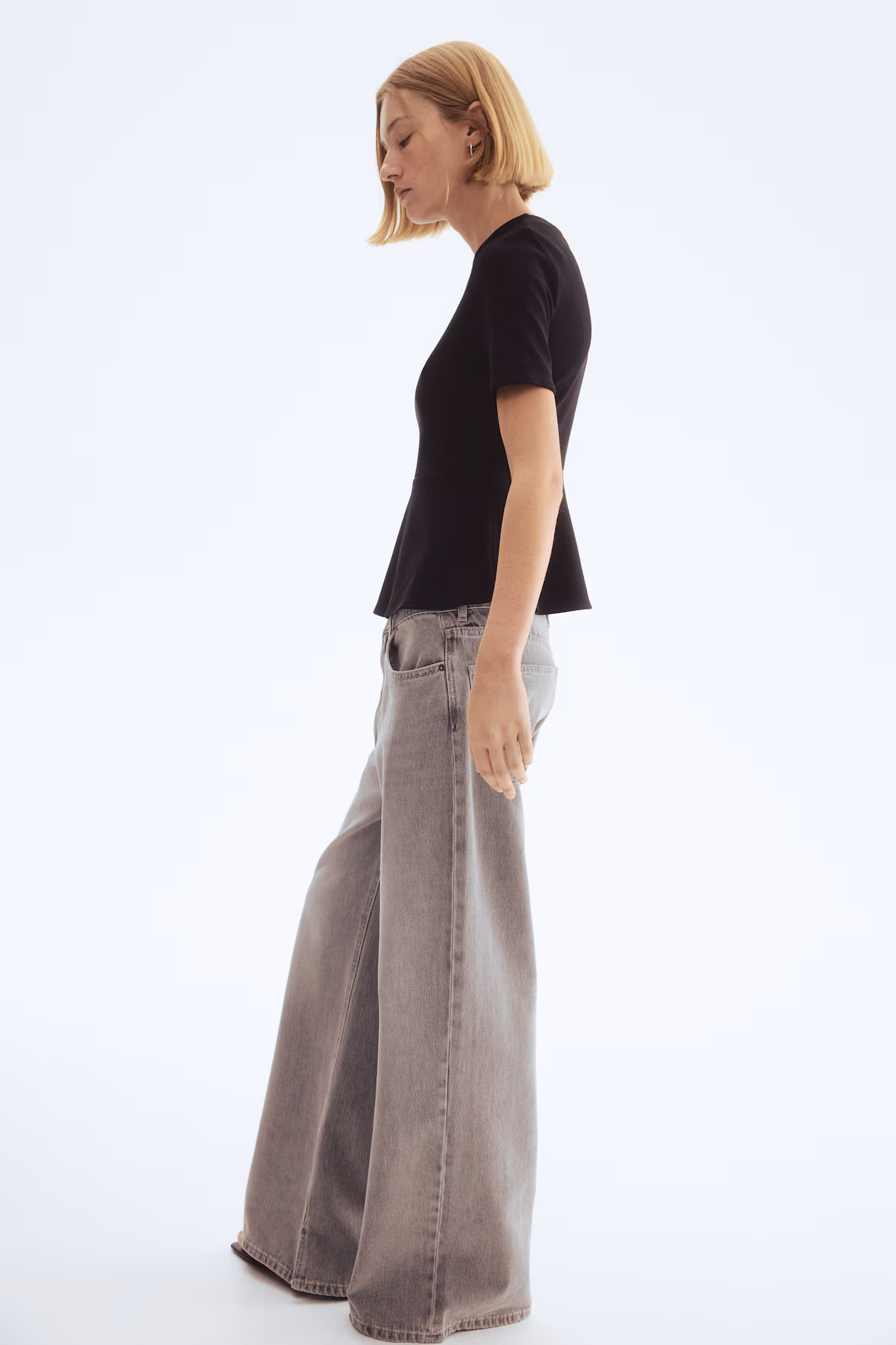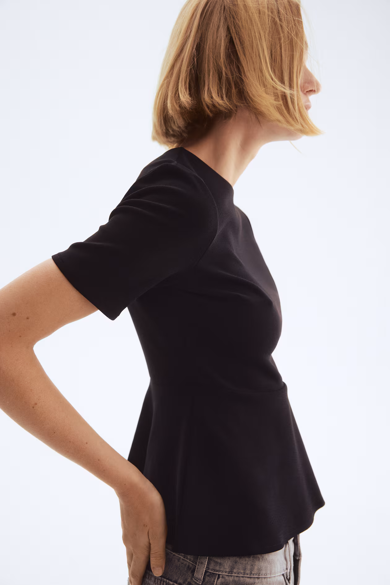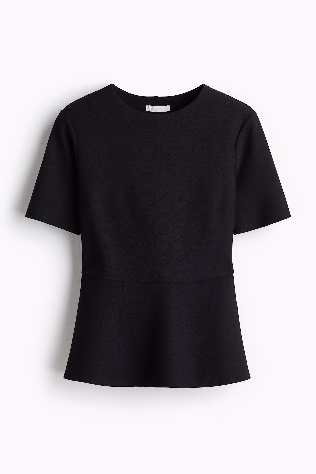 Top in crêpe jersey. Round neckline, short sleeves, and darts at bust. Flared peplum.