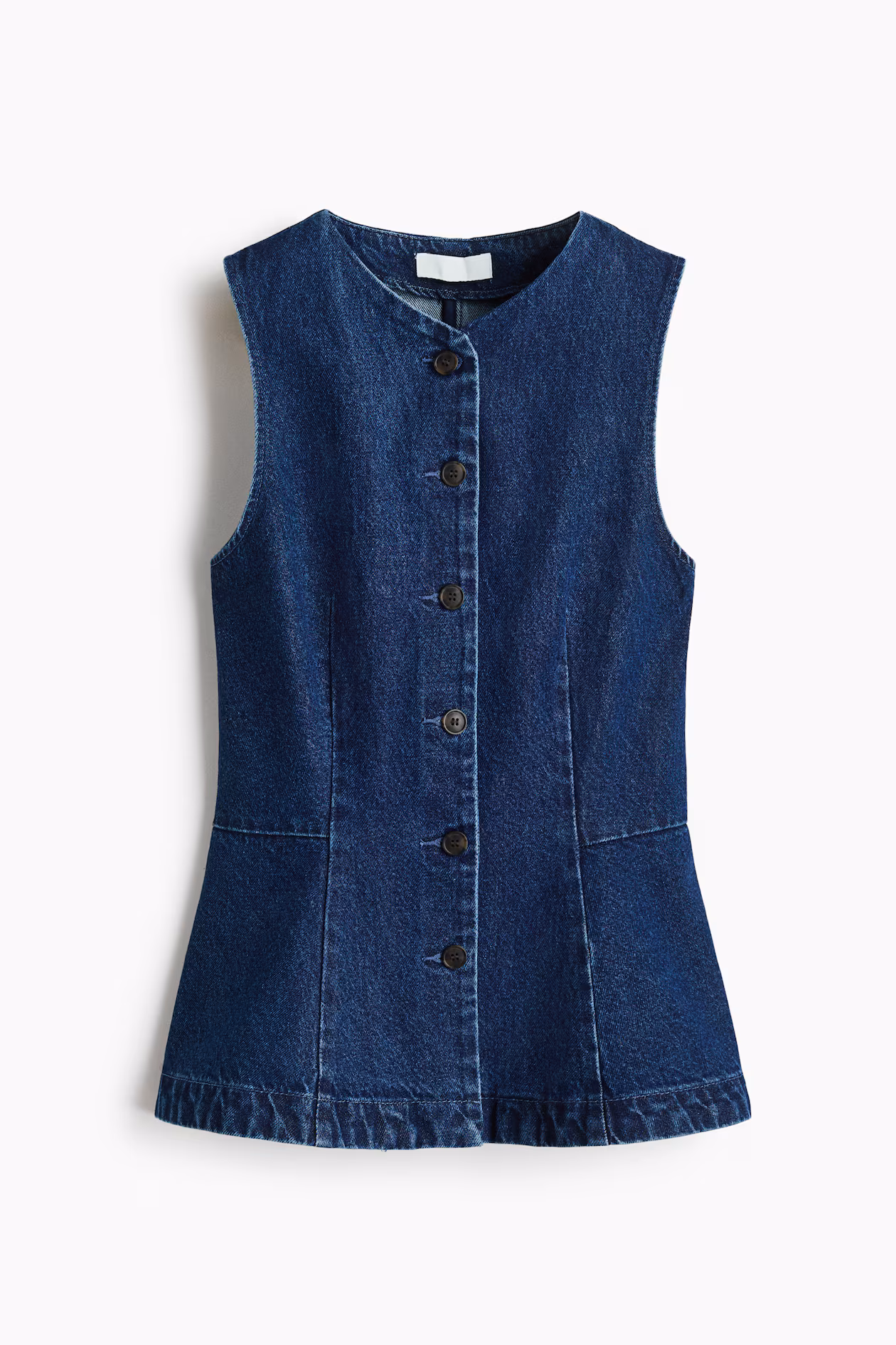 V-neck Vest in woven fabric with buttons at front. Shaping seams at waist and a flared peplum for a tapered silhouette. Lined.