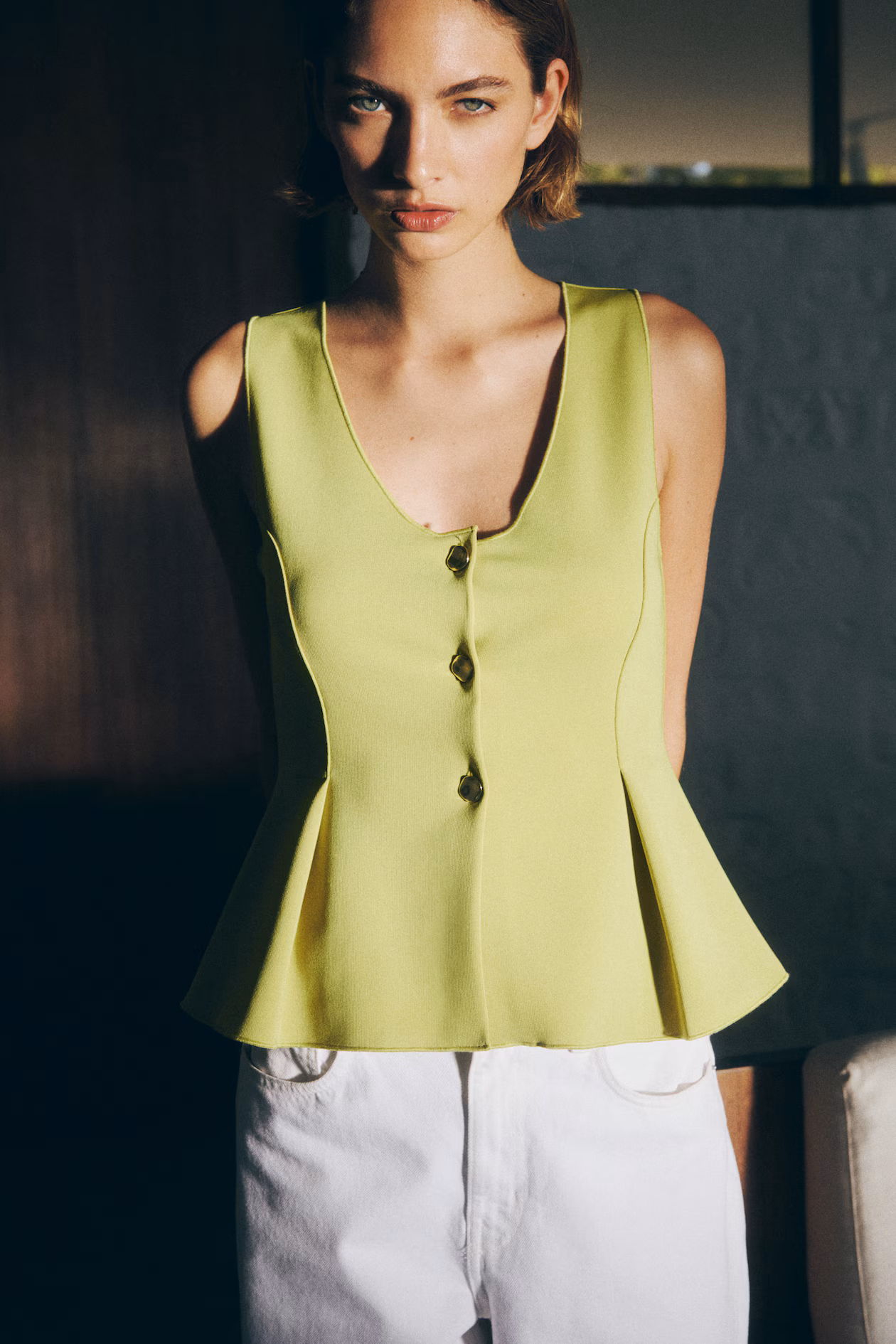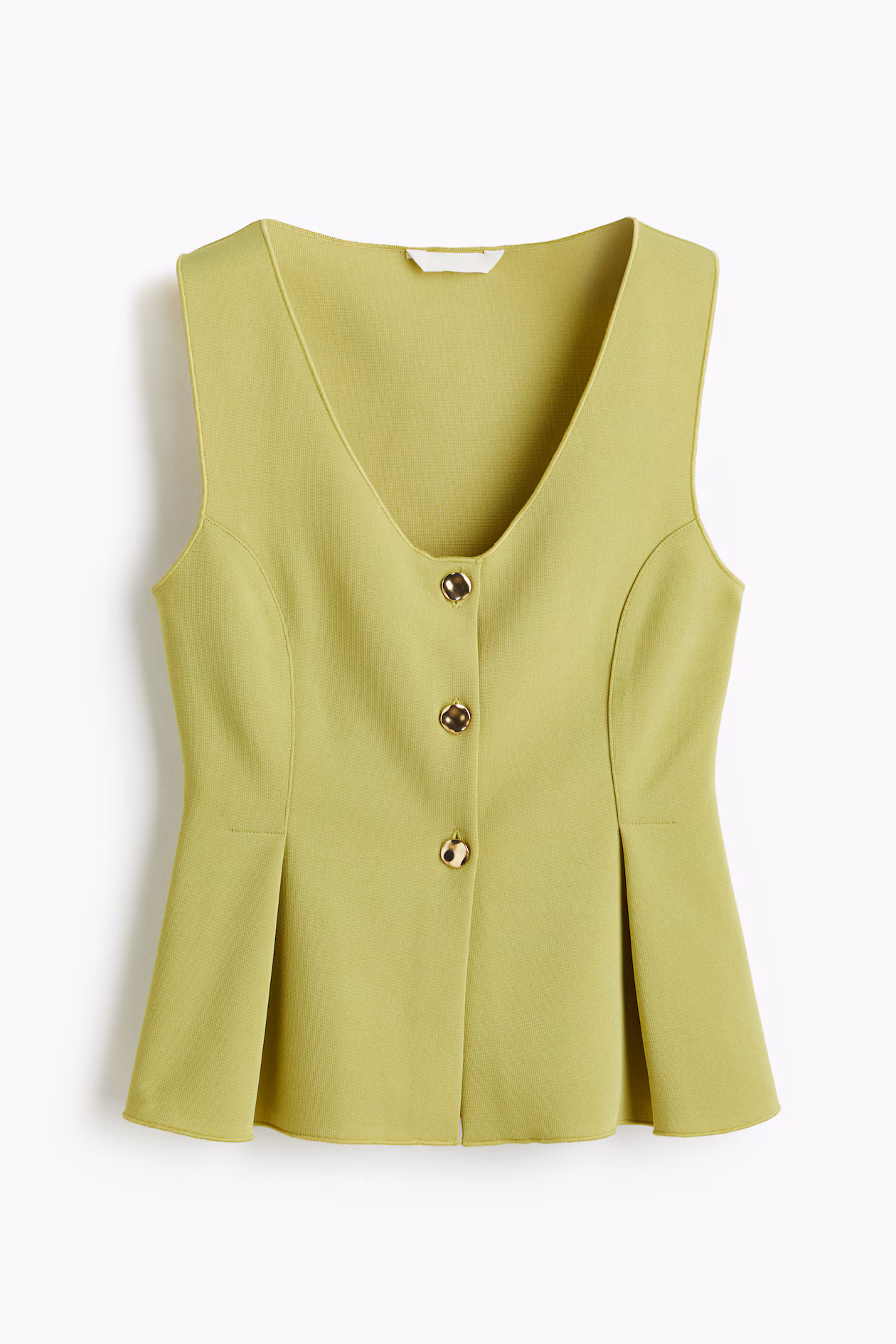 Fitted vest in thick interlock jersey with overlocked edges for a sophisticated finish. V-neck, buttons at front, and princess seams at front and back, opening into a pleated, flared peplum.