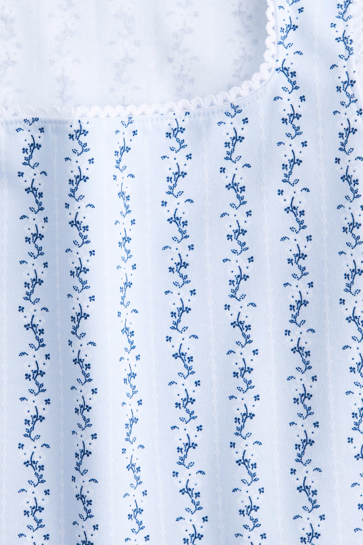 Short, fitted, sleeveless top in soft cotton jersey. Square neckline and delicate picot trim at neckline and armholes.