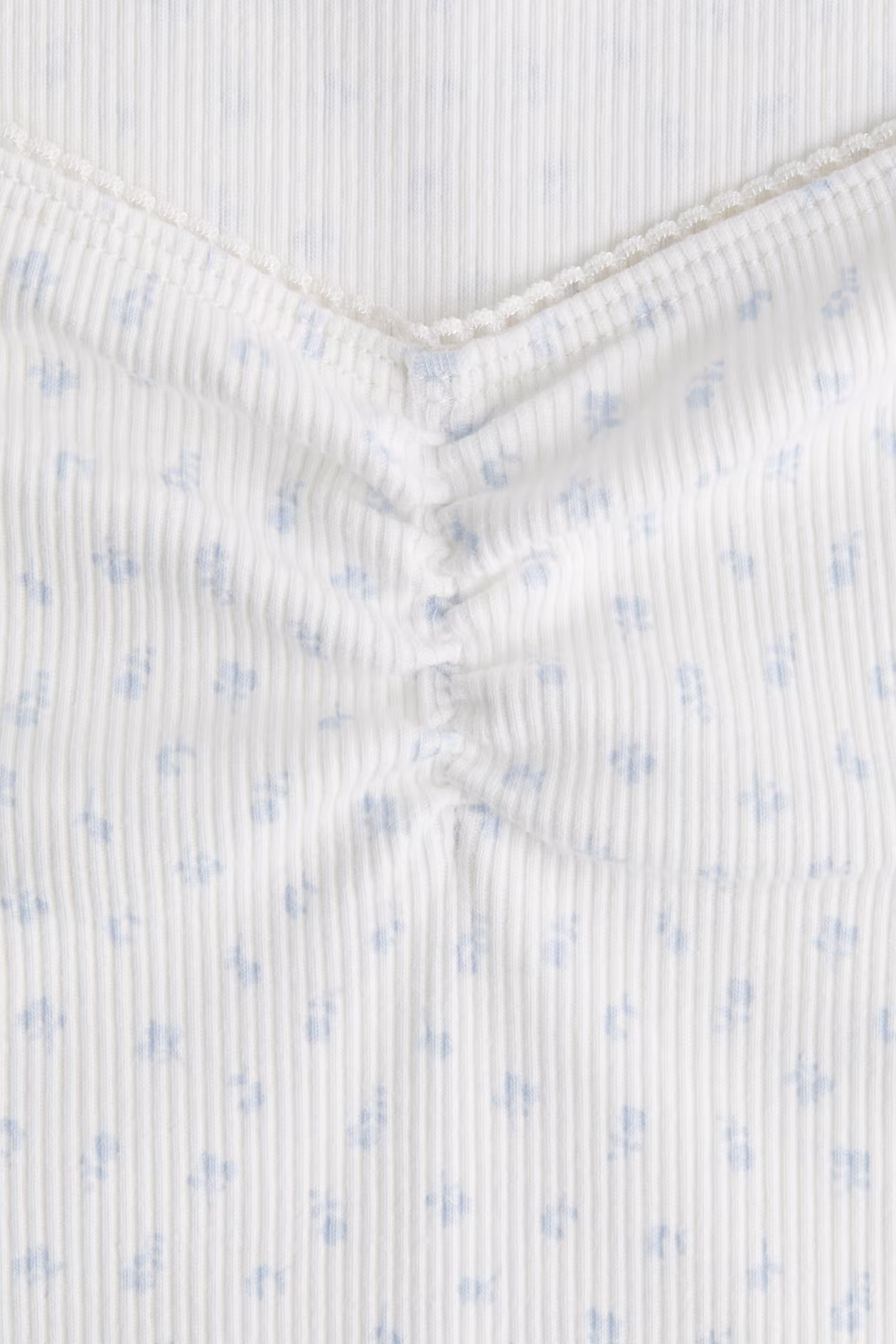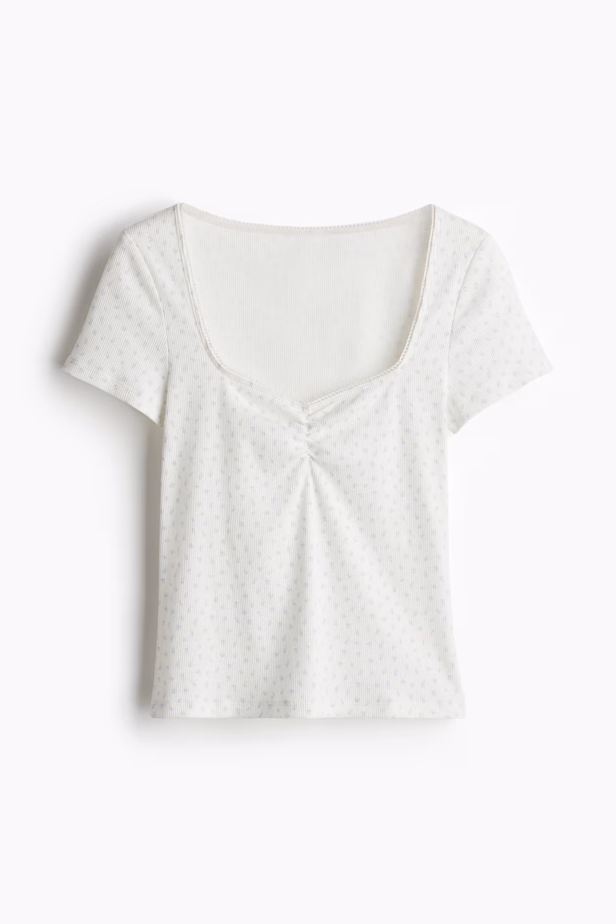 Short, fitted T-shirt in soft jersey. Low-cut sweetheart neckline with delicate picot trim, gathered seam at center bust, and a straight-cut hem.