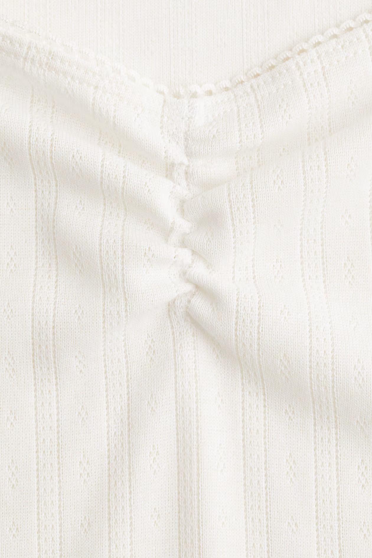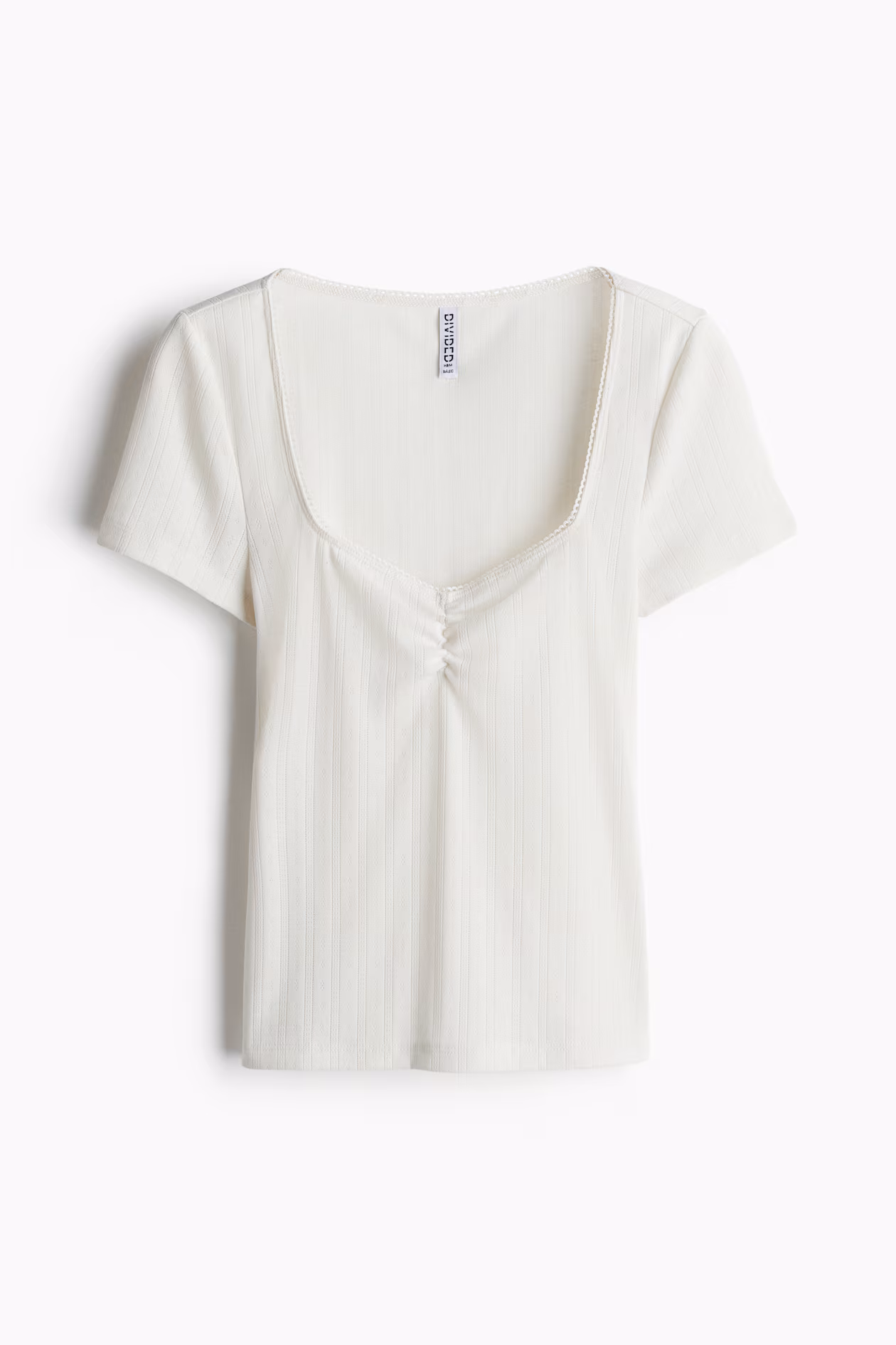 Short, fitted T-shirt in soft jersey. Low-cut sweetheart neckline with delicate picot trim, gathered seam at center bust, and a straight-cut hem.