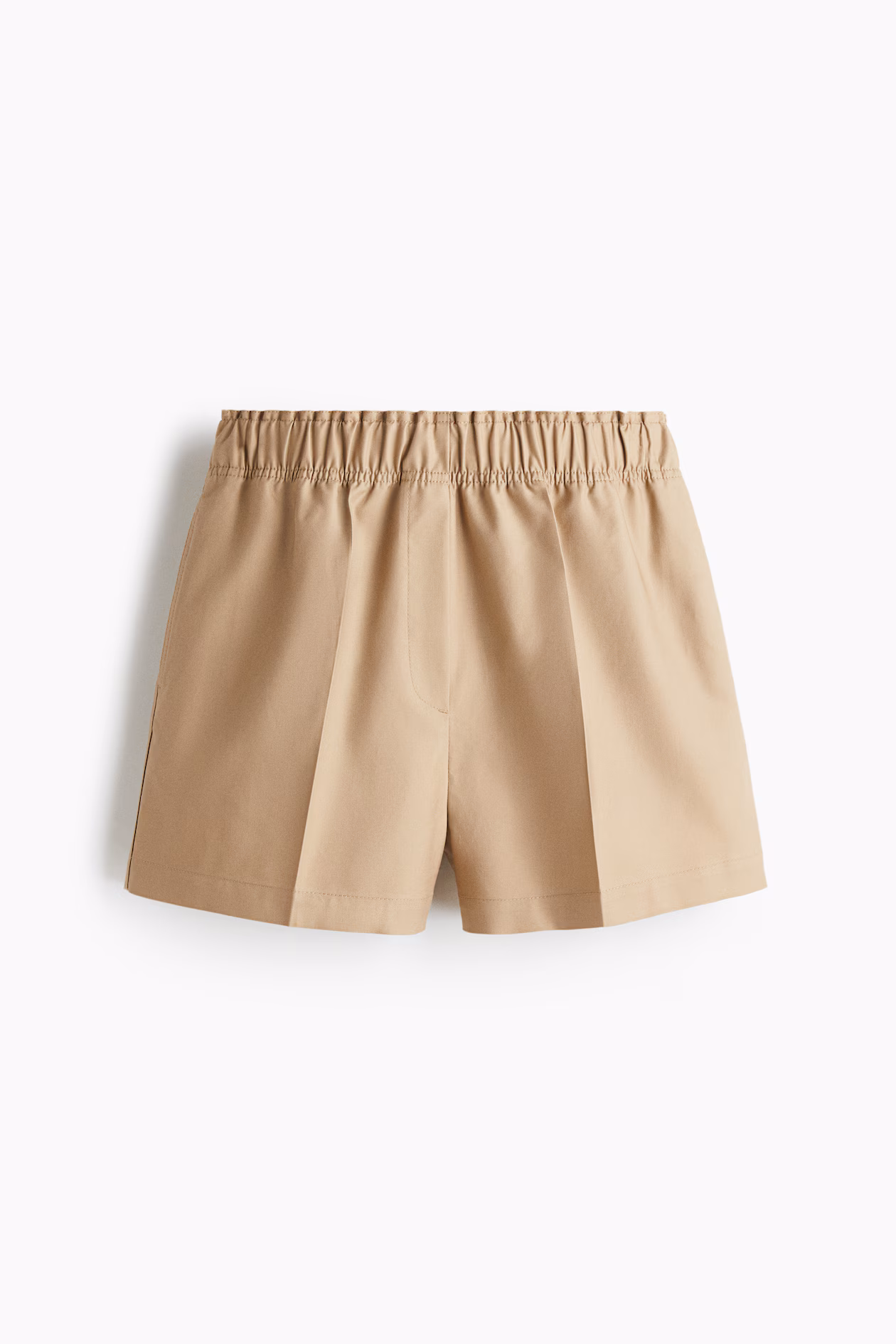 Loose-fit shorts in pima cotton twill with creases at front and back. High waist, covered elastic at waistband, and mock fly. Discreet side pockets and patch back pockets.