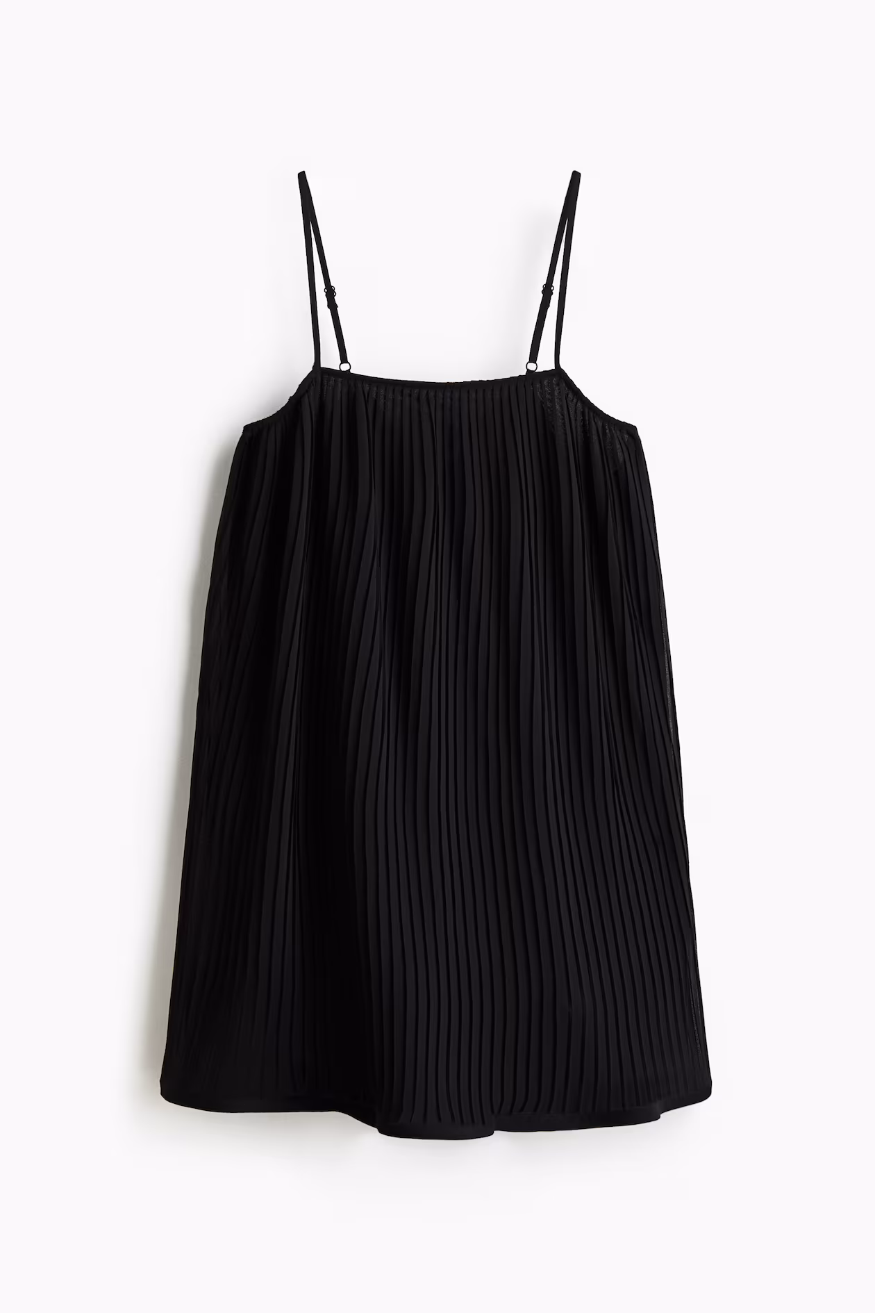 Short, loose-fit dress in pleated chiffon. Narrow, adjustable shoulder straps, straight neckline, and boning at hem for added structure. Jersey lining.