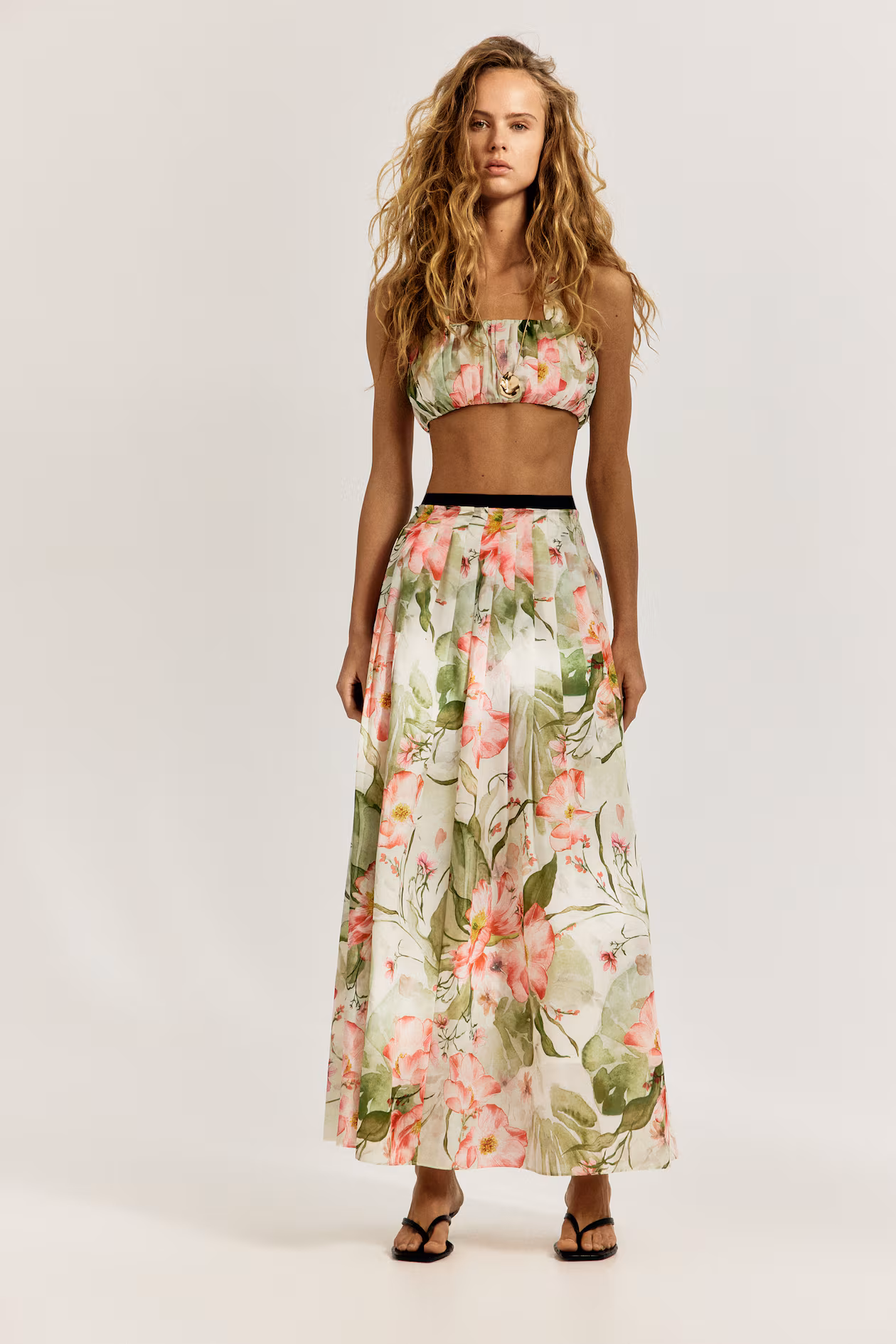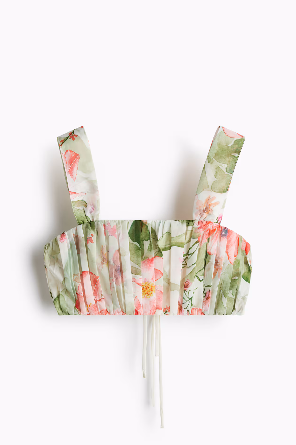 Pleated crop top in woven fabric. Wide shoulder straps and two sets of narrow ties at back. Lined.