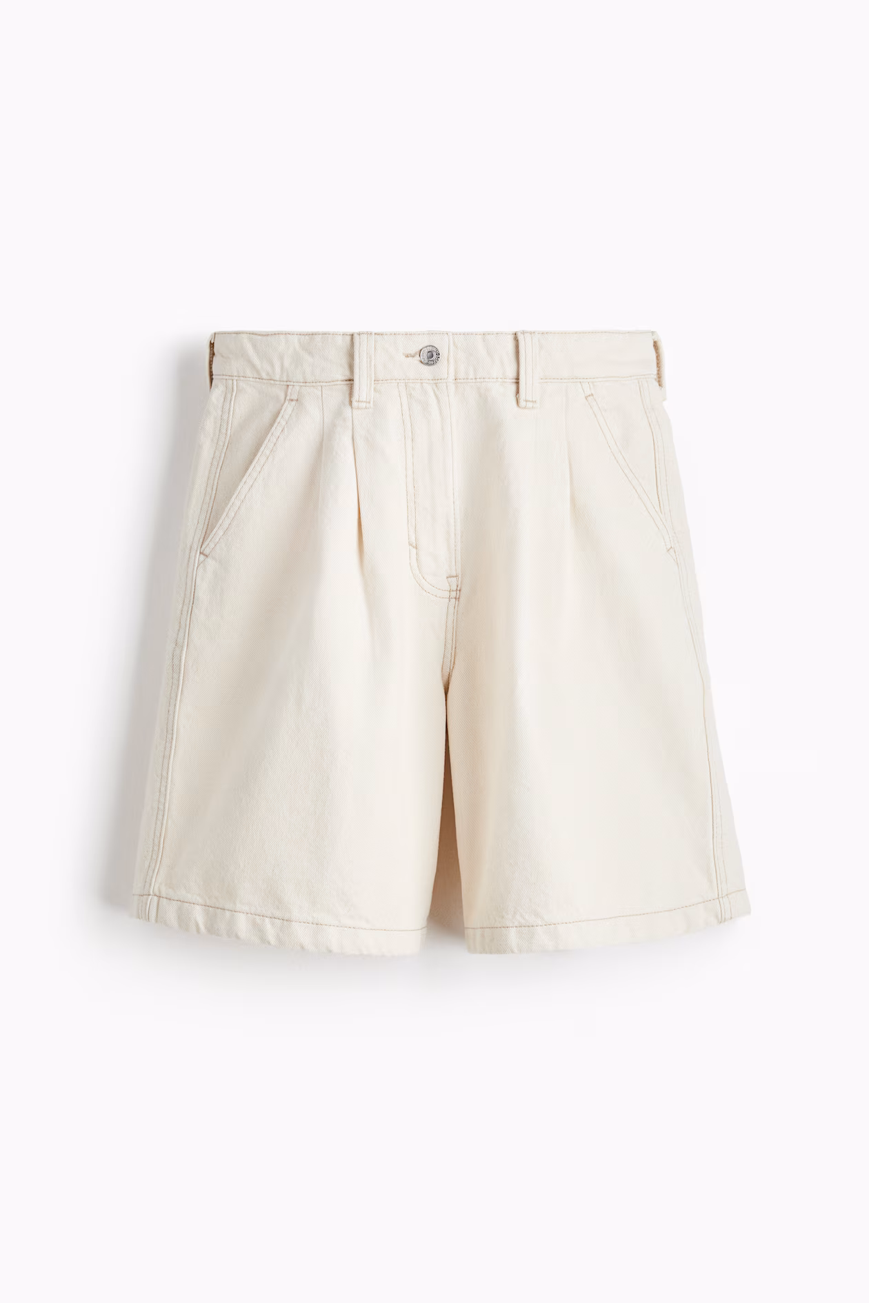 Knee-length shorts in rigid cotton denim with pleats at front. Zip fly with button, diagonal side pockets, and welt back pockets.