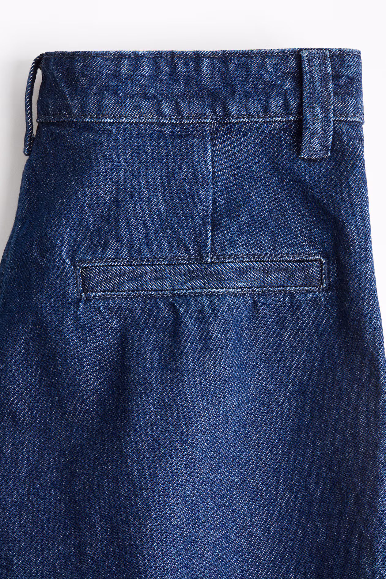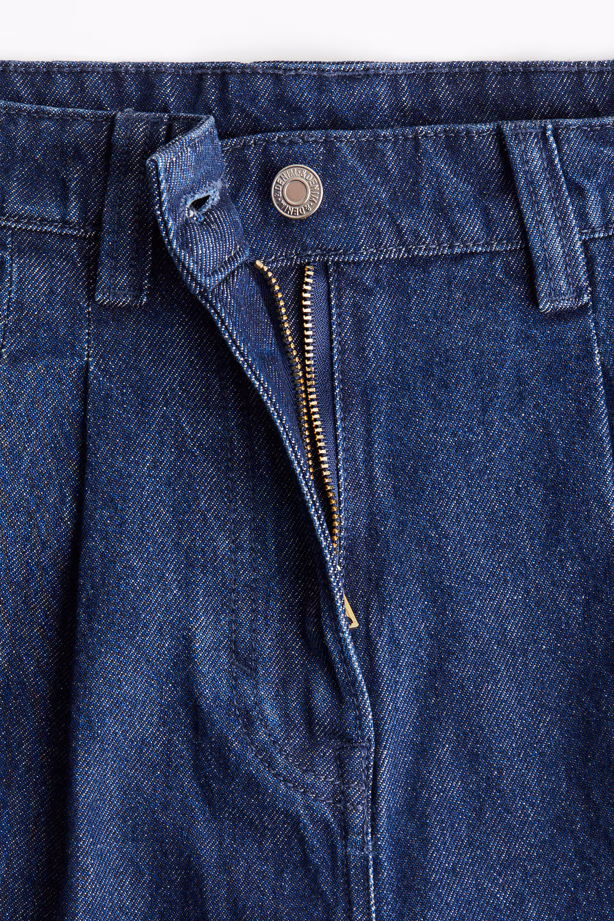 Knee-length shorts in rigid cotton denim with pleats at front. Zip fly with button, diagonal side pockets, and welt back pockets.