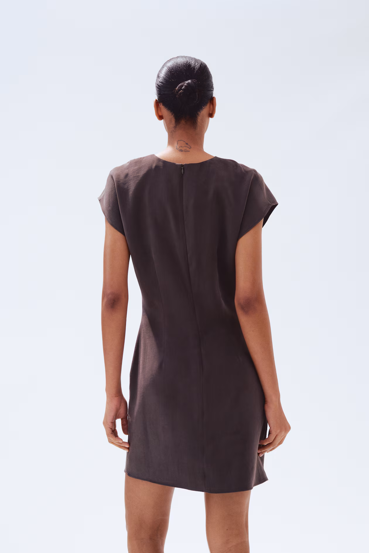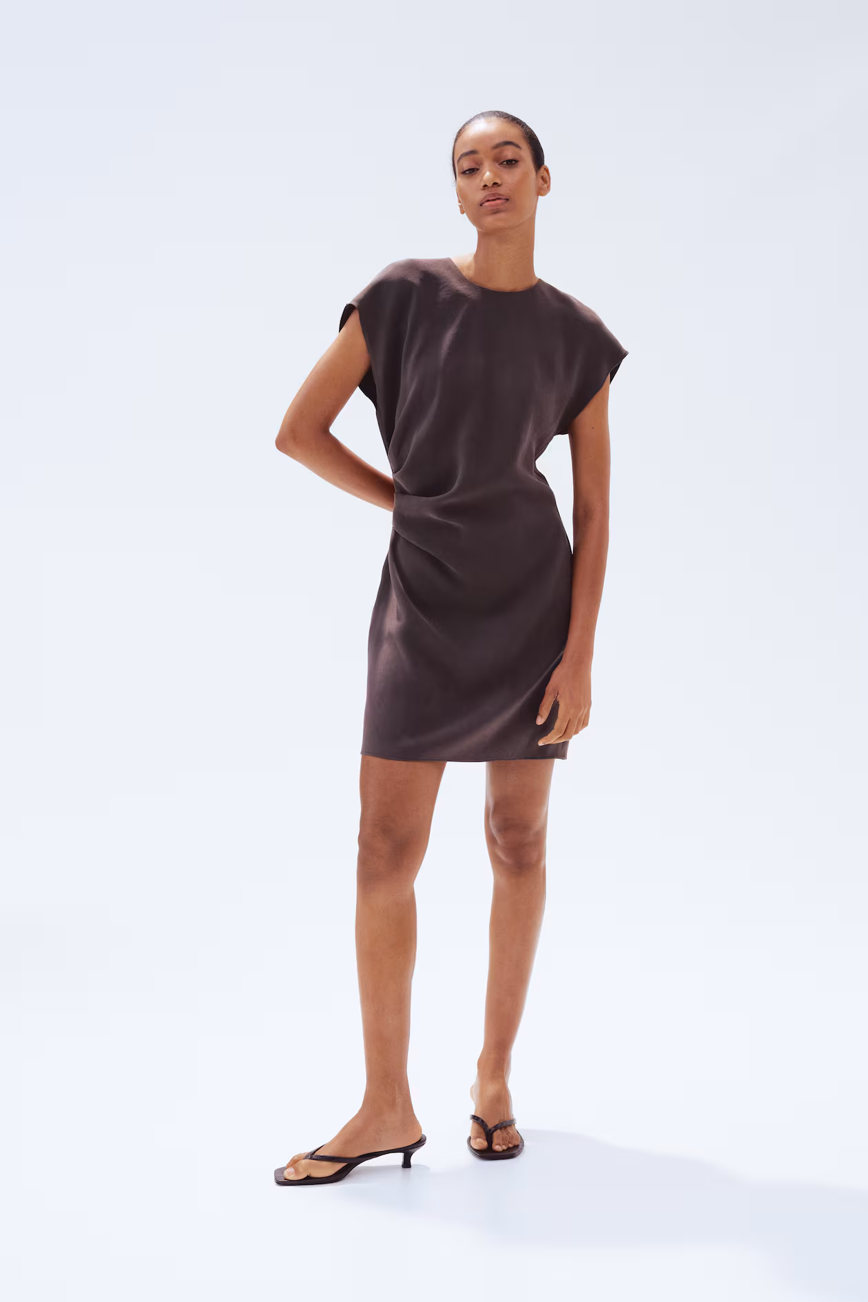Short, fitted dress in stretchy, woven modal. Round neckline, concealed zipper at back, and cap sleeves. Pleats at one side of waist for a flattering, gently draped effect. Unlined.