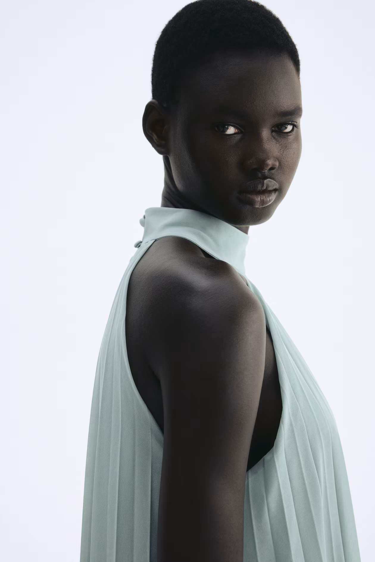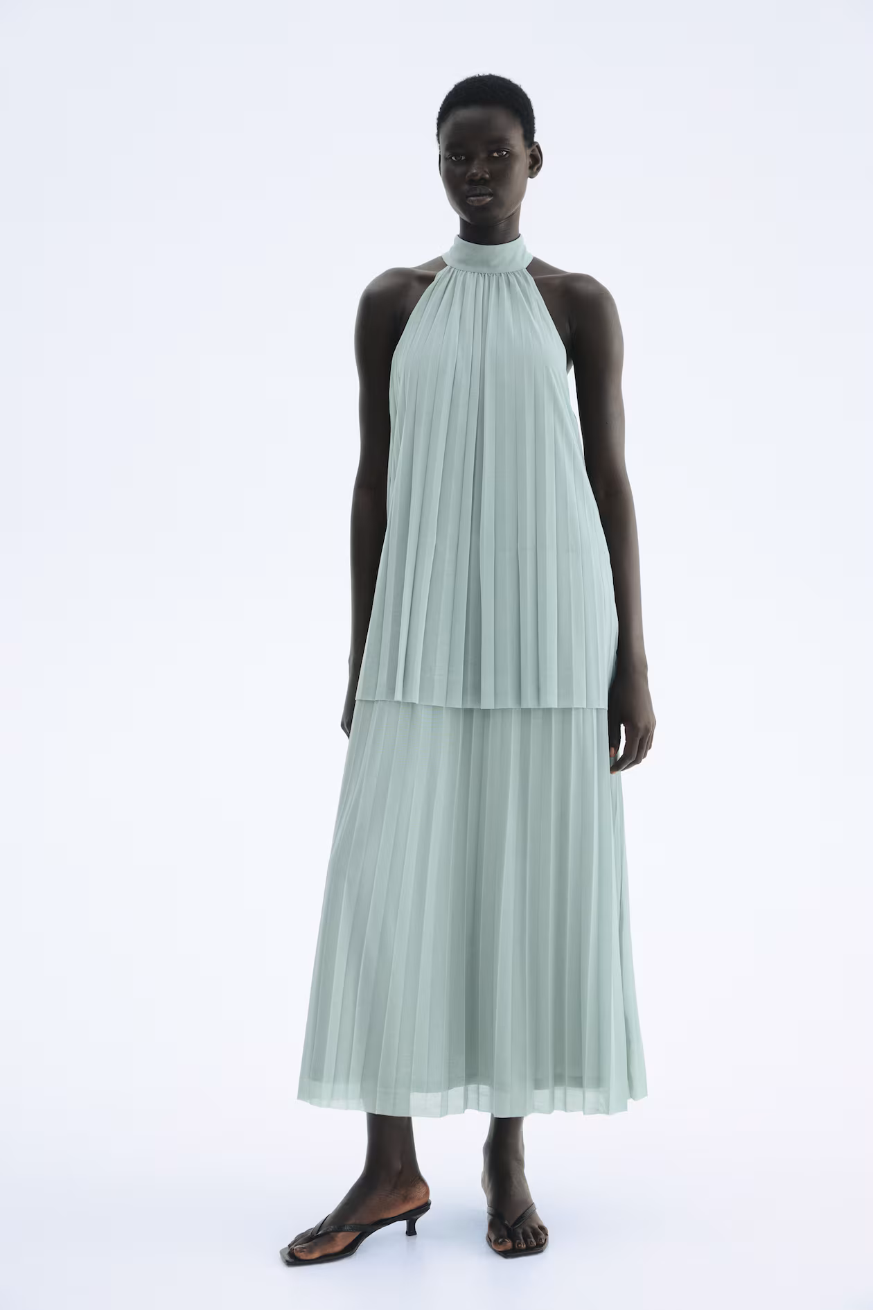 Sleeveless, ankle-length dress in pleated jersey with a layered design. Stand-up collar and a keyhole opening at back with covered buttons. Lined.