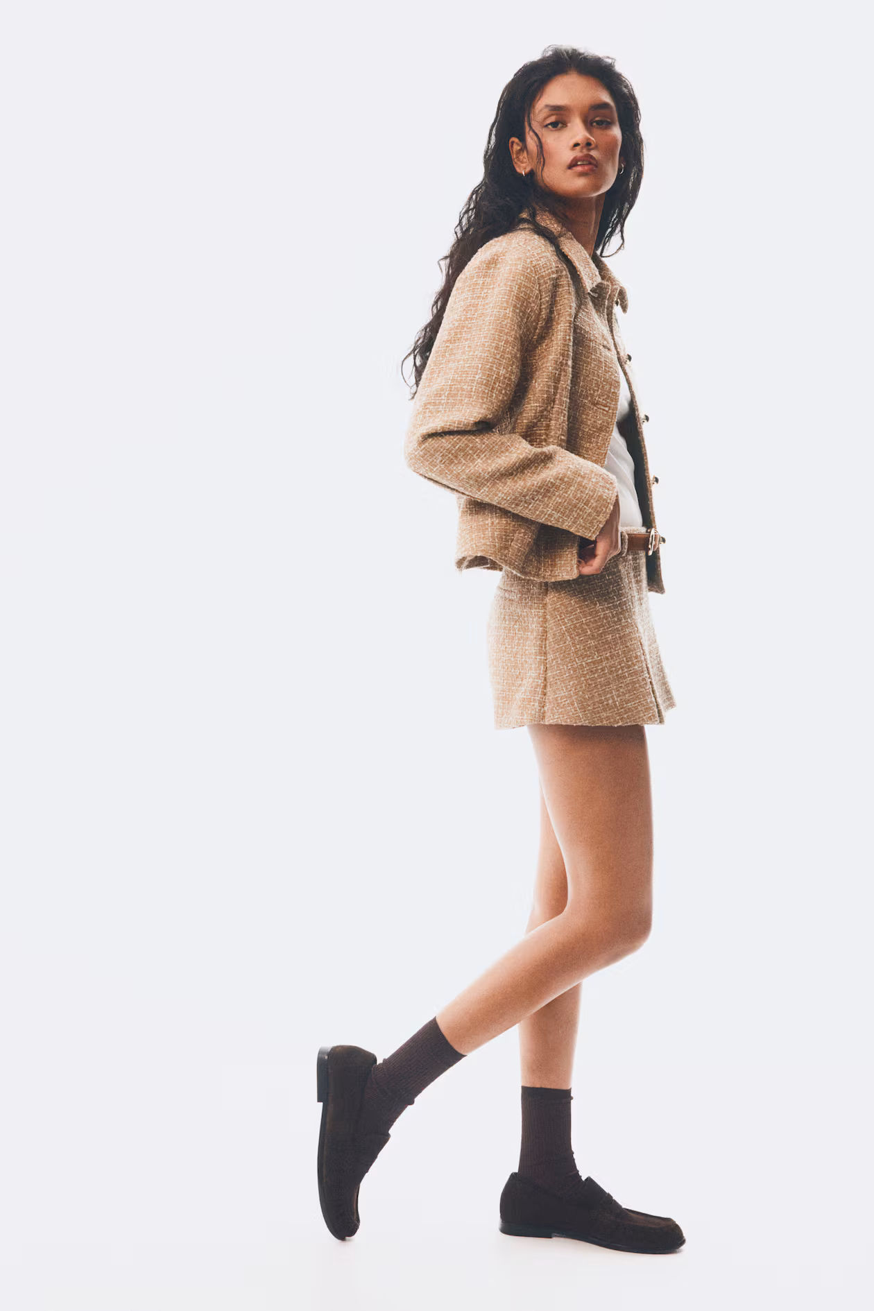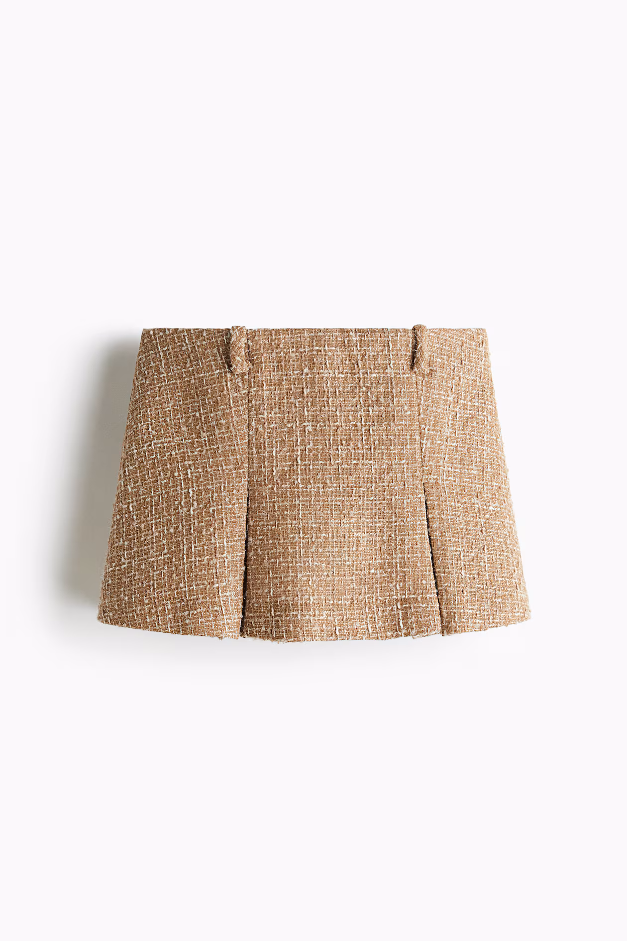 Mini skort in woven fabric. Regular waist, zipper at one side with hook-and-eye fastener, inverted box pleats at front, and mock welt back pockets.