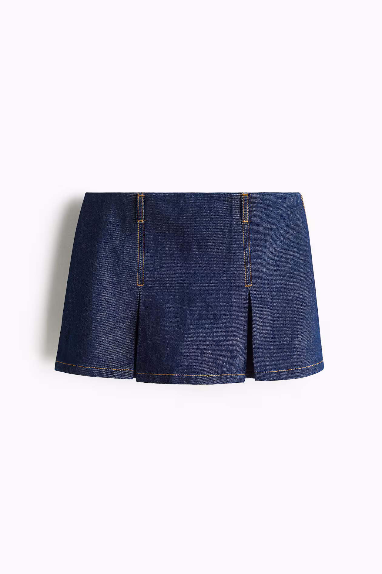Mini skort in woven fabric. Regular waist, zipper at one side with hook-and-eye fastener, inverted box pleats at front, and mock welt back pockets.