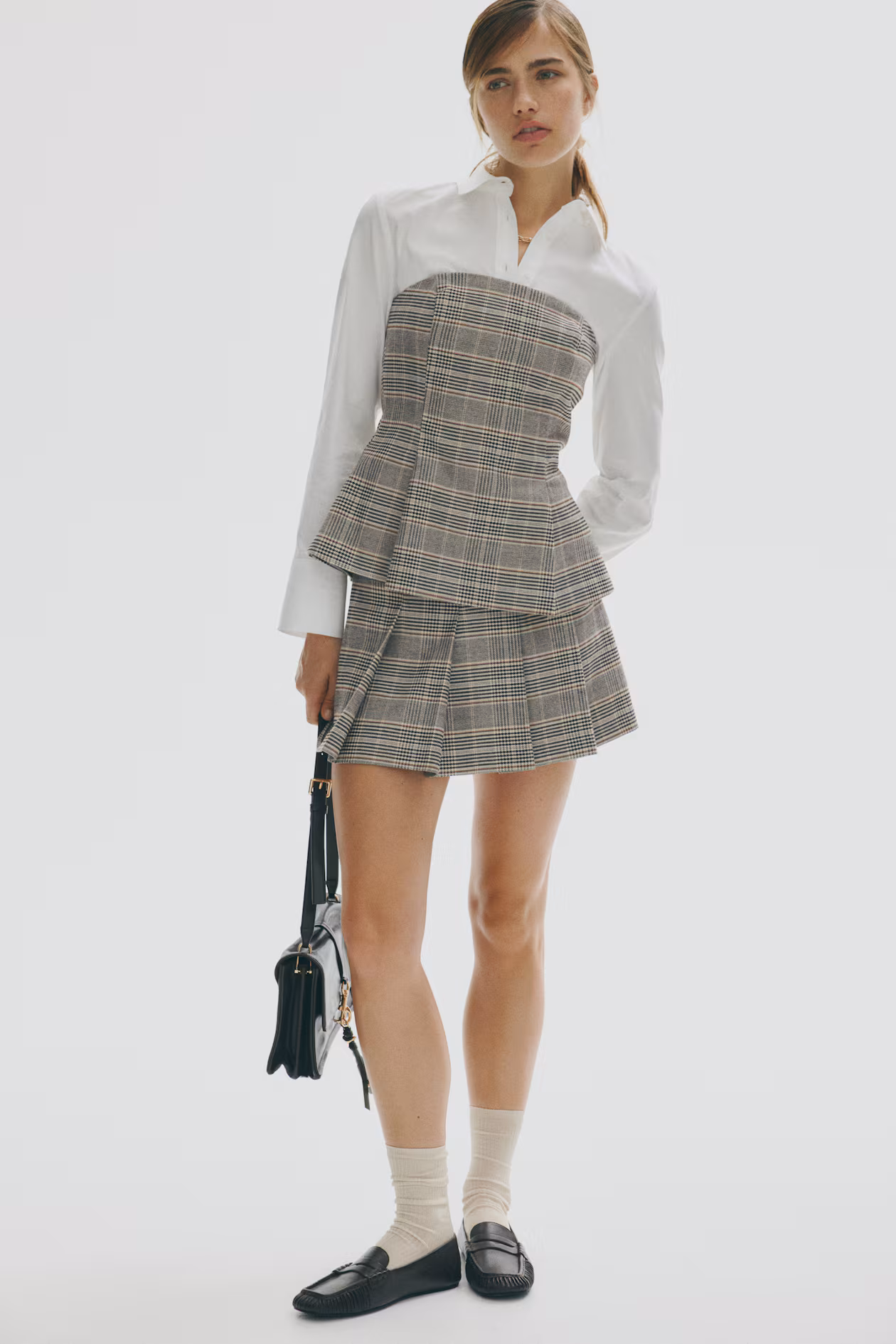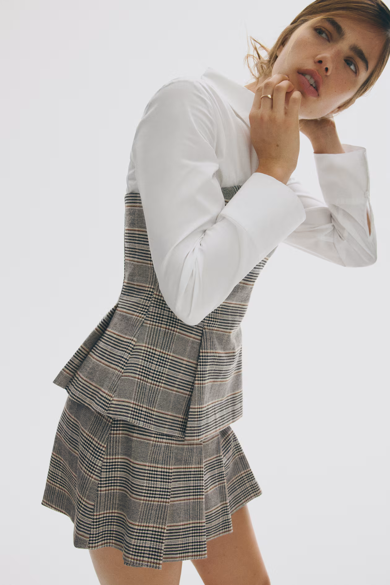 Fitted mini skirt in soft woven fabric with a flattering A-line silhouette. Regular waist, concealed zipper at one side, and knife pleats at front.