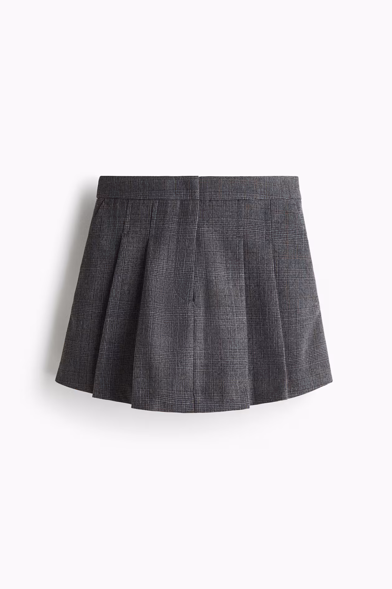 Short skort in woven fabric with pleats at front and creases at back. Zip fly with concealed button and hook-and-bar fastener, diagonal side pockets, and welt back pockets.