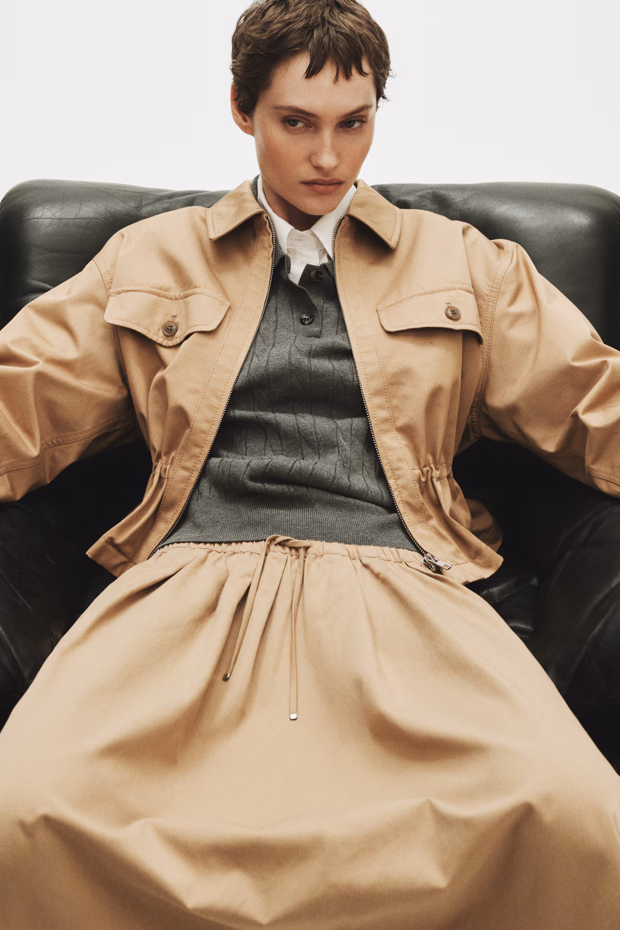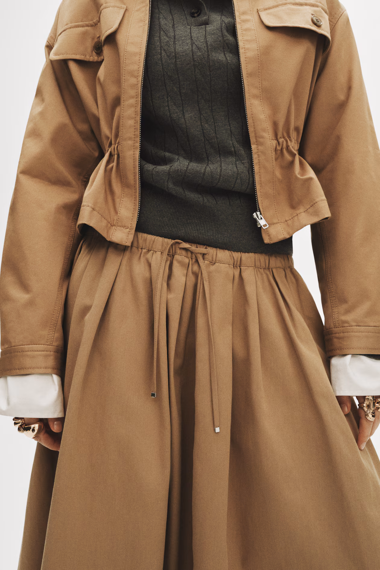 Flared, calf-length skirt in pleated twill made from a cotton and lyocell blend. Regular waist with a drawstring and covered elastic at waistband. Unlined.