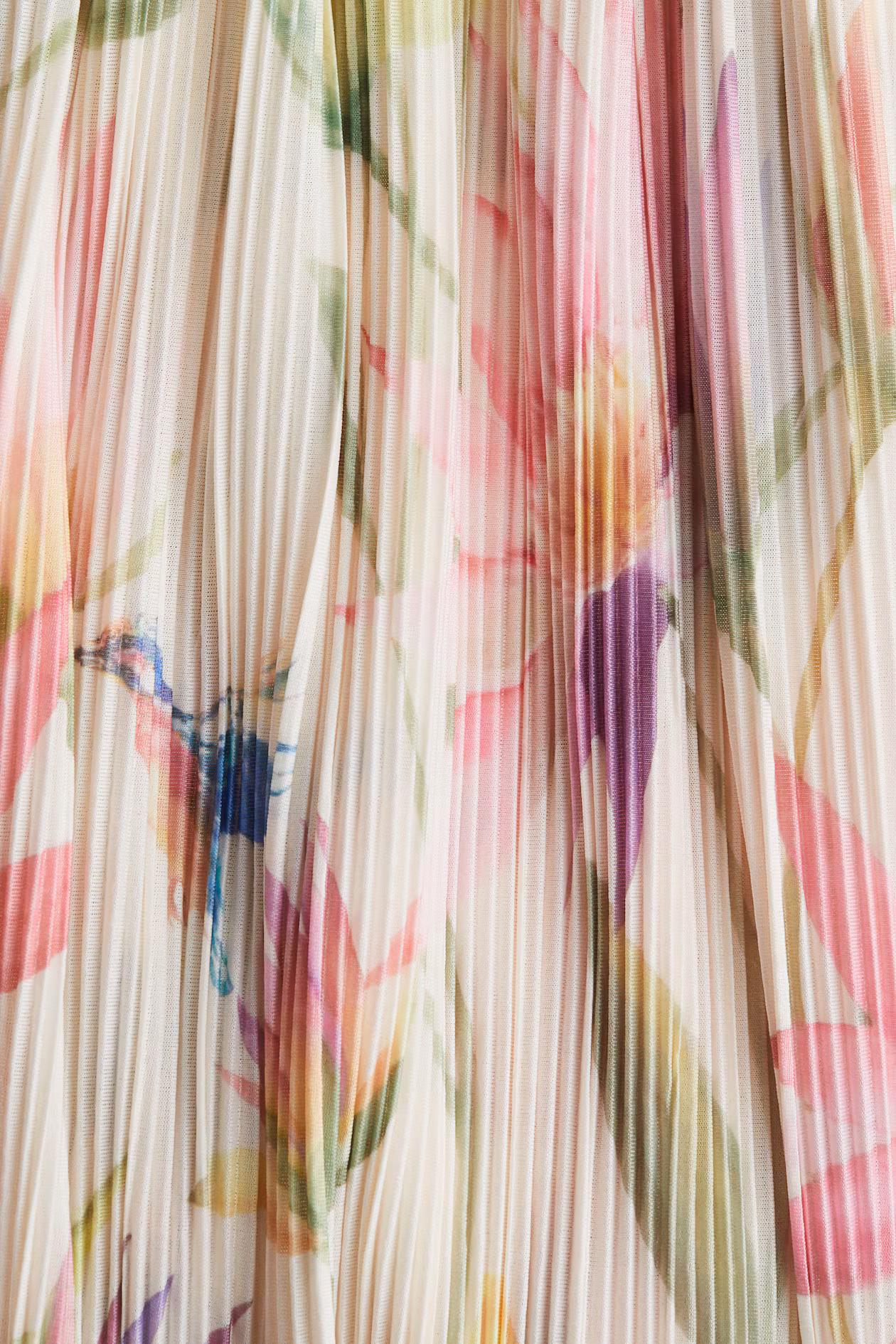 Short dress in plissé jersey. Low-cut V-neck, diagonal seams below bust, long balloon sleeves, and elasticized cuffs with narrow ties. A-line skirt with a raw-edge hem.