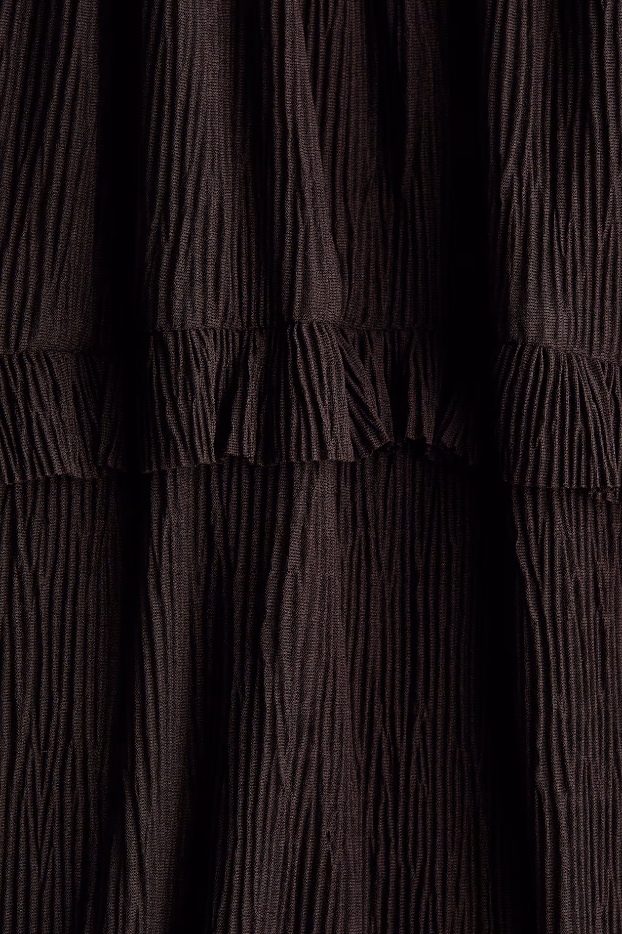 Short dress in sheer plissé jersey. Low stand-up collar, V-shaped opening at front, and covered buttons at back of neck. Ruffle trim at bust, long raglan balloon sleeves with narrow elastic at cuffs, and ruffle trim above hem. Partly lined.