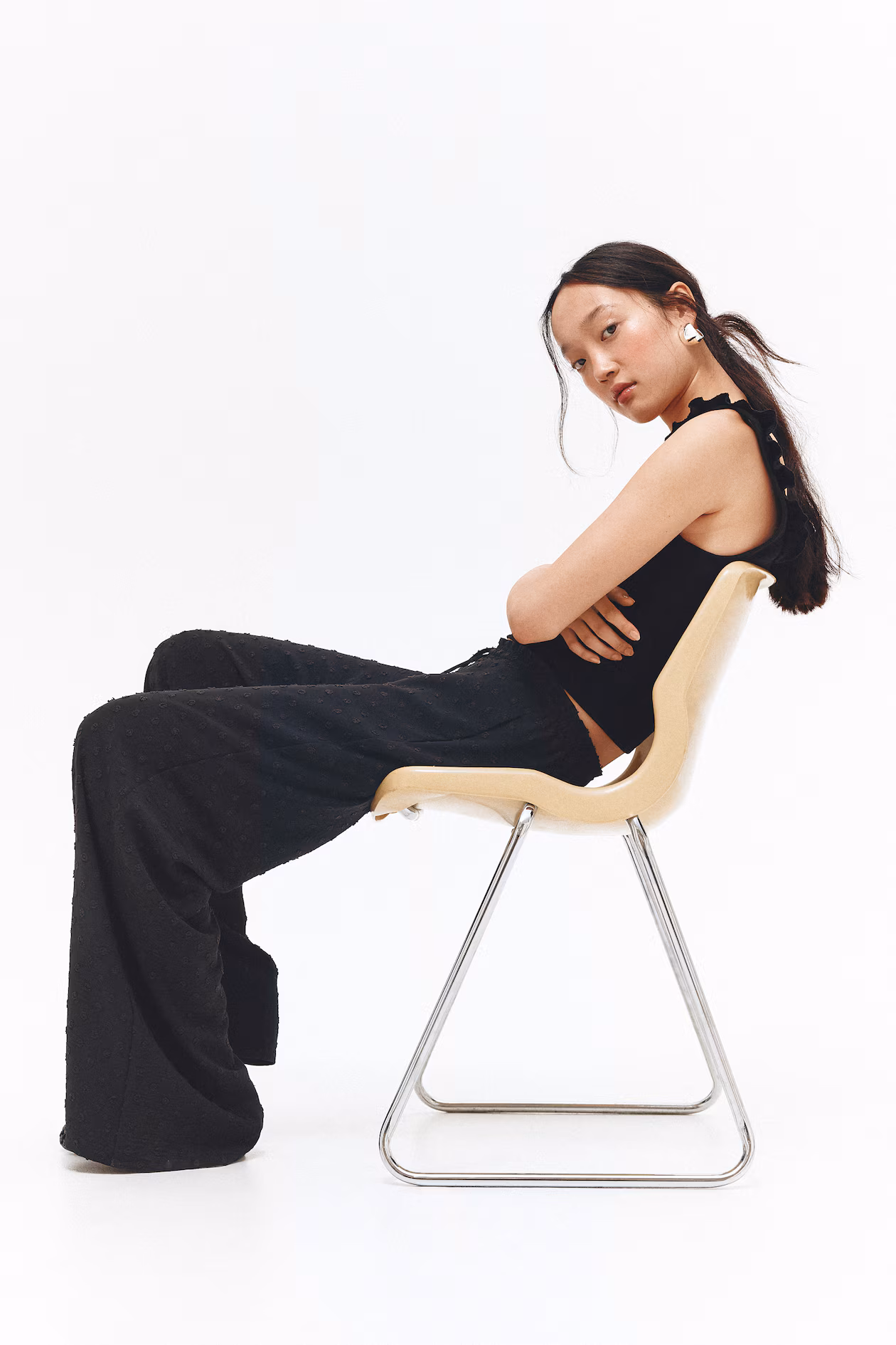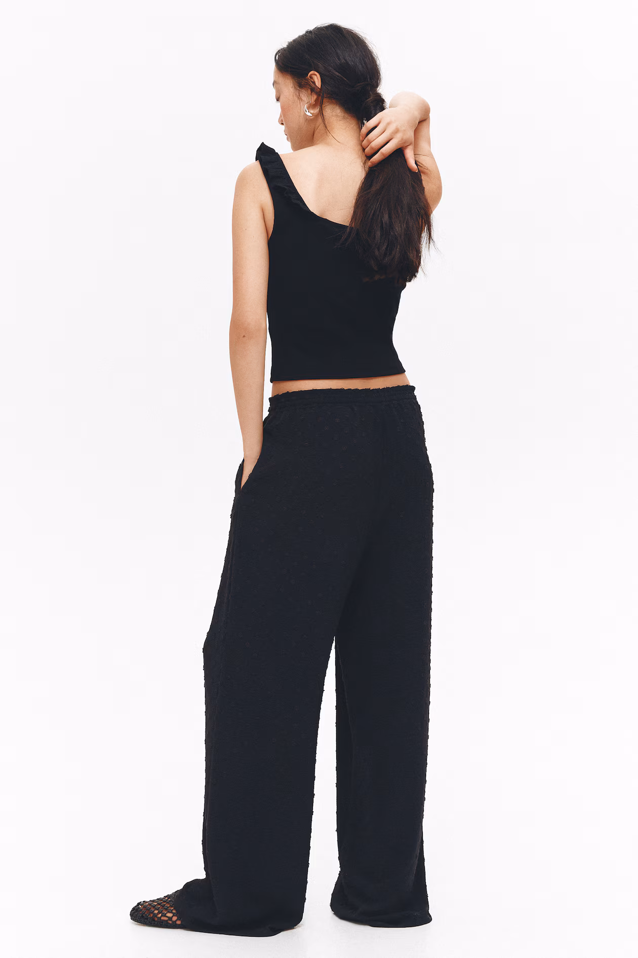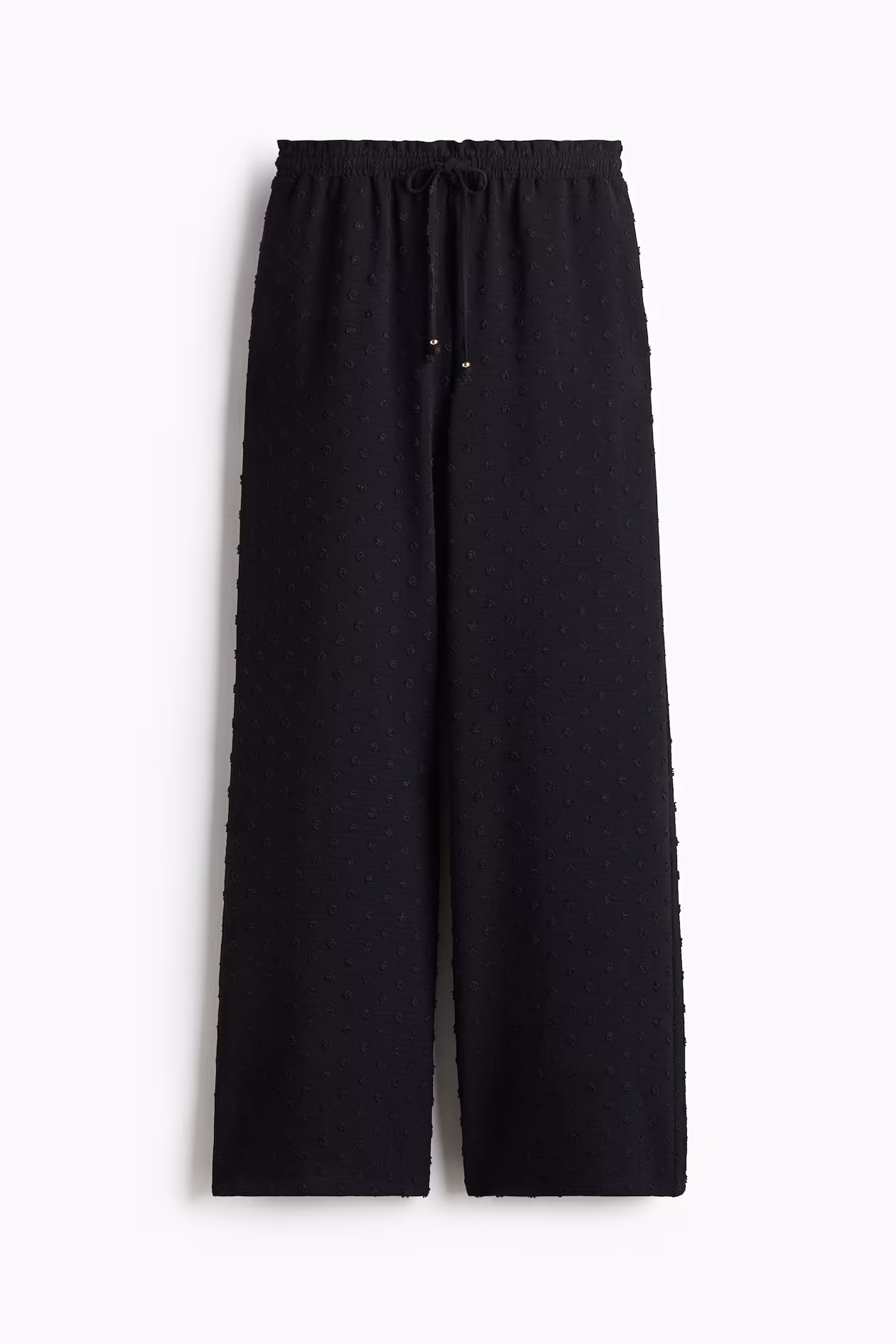 Loose-fit pants in plumeti. High waist and waistband with ruffle trim, smocked elastic, and a narrow drawstring. Discreet side-seam pockets and wide legs.