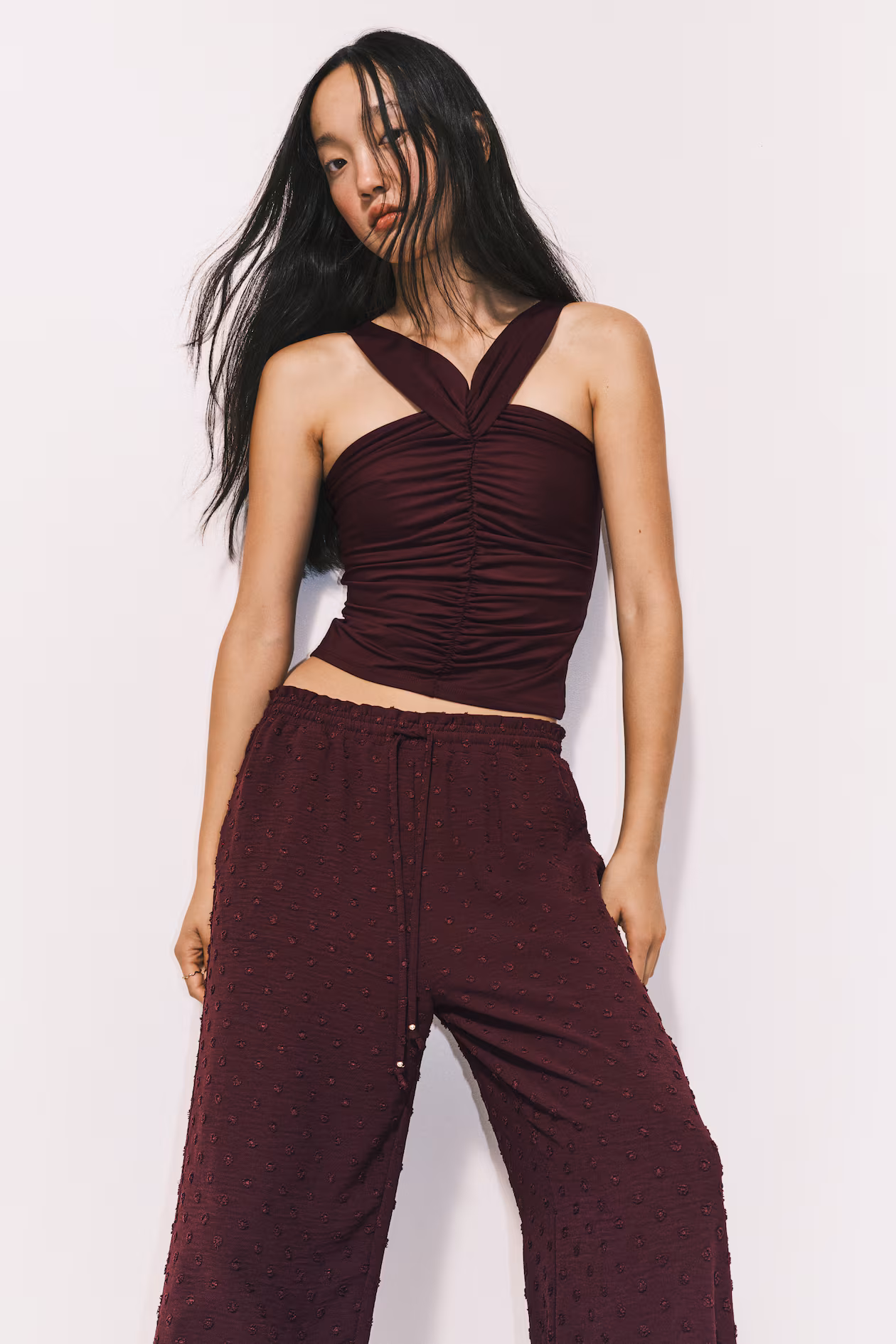 Loose-fit pants in plumeti. High waist and waistband with ruffle trim, smocked elastic, and a narrow drawstring. Discreet side-seam pockets and wide legs.