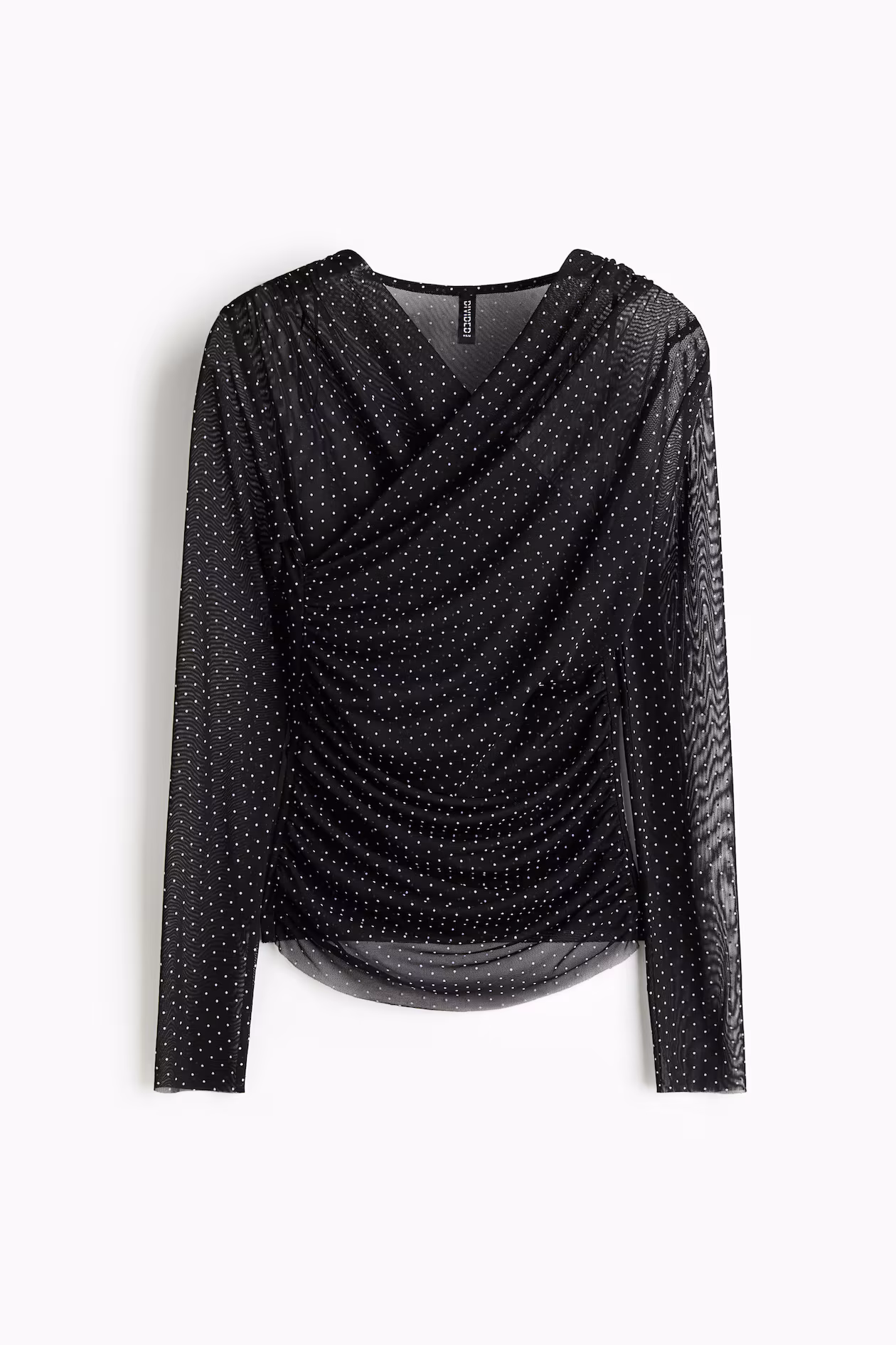 Fitted, long-sleeved top in plumeti mesh with a V-shaped, wrapover neckline. Gathers on shoulders and at sides for a gently draped effect.