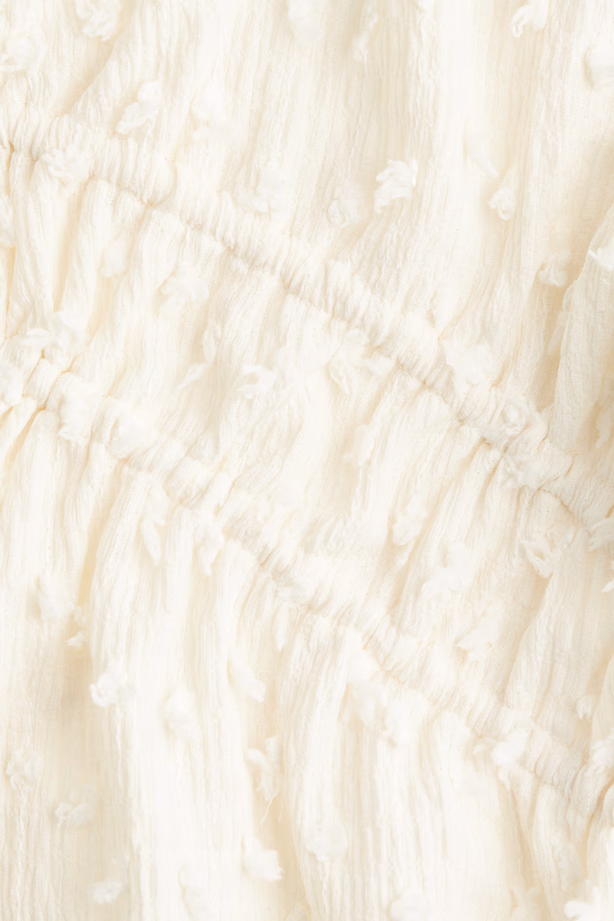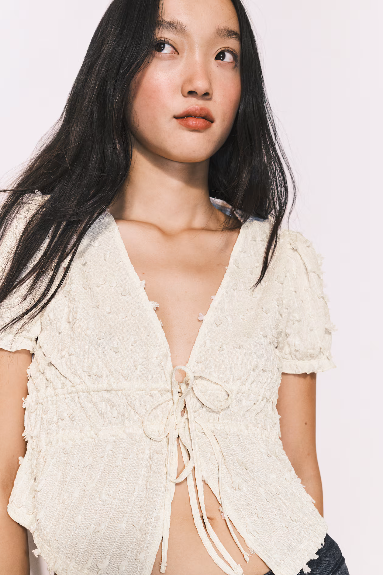 Short, fitted top in textured plumeti jersey. Low-cut V-shaped neckline at front, two sets of drawstrings below bust for a gently flared hem when tied, short sleeves, and cuffs with covered elastic and overlocked edges.