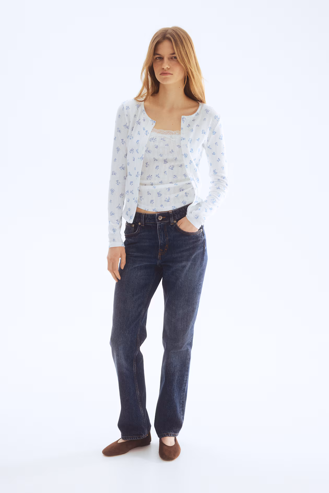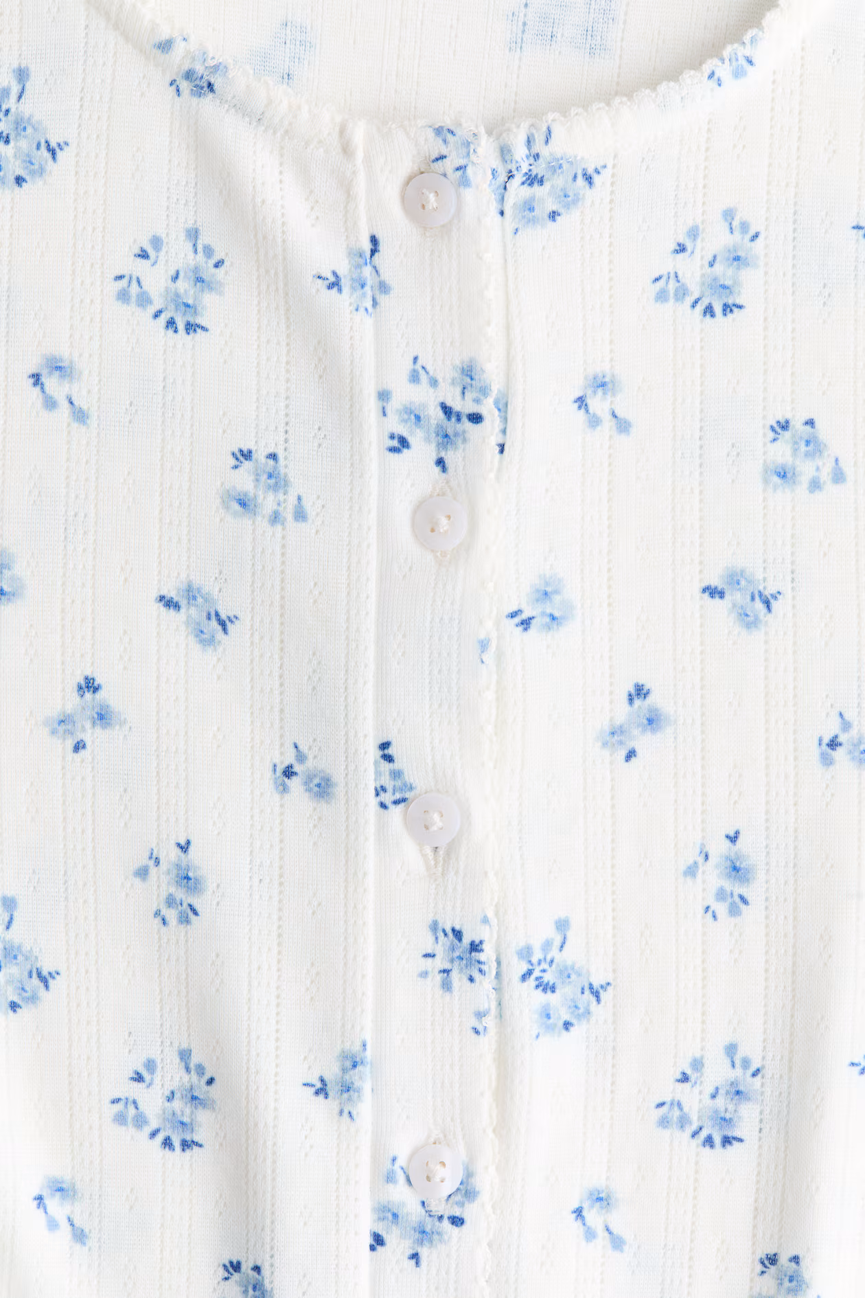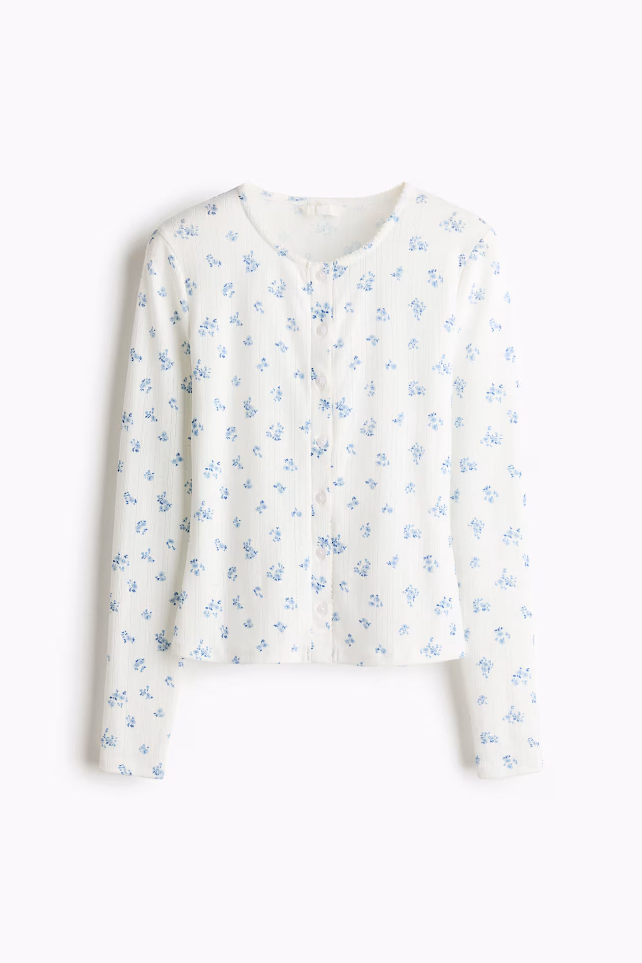 Fitted cardigan in soft pointelle jersey featuring a round neckline and button band with picot trims.