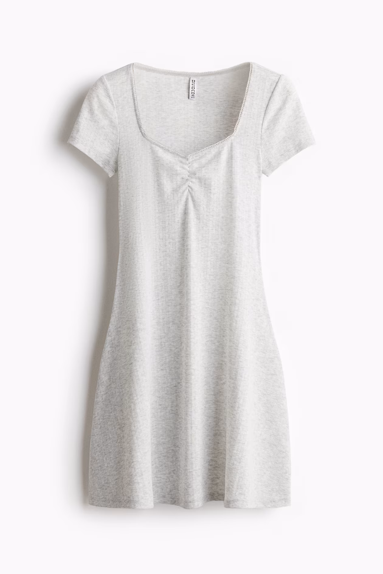 Mini dress in pointelle jersey with a fitted bodice and gently flared skirt. Square neckline with delicate picot trim, a gathered seam at center bust, and short sleeves.