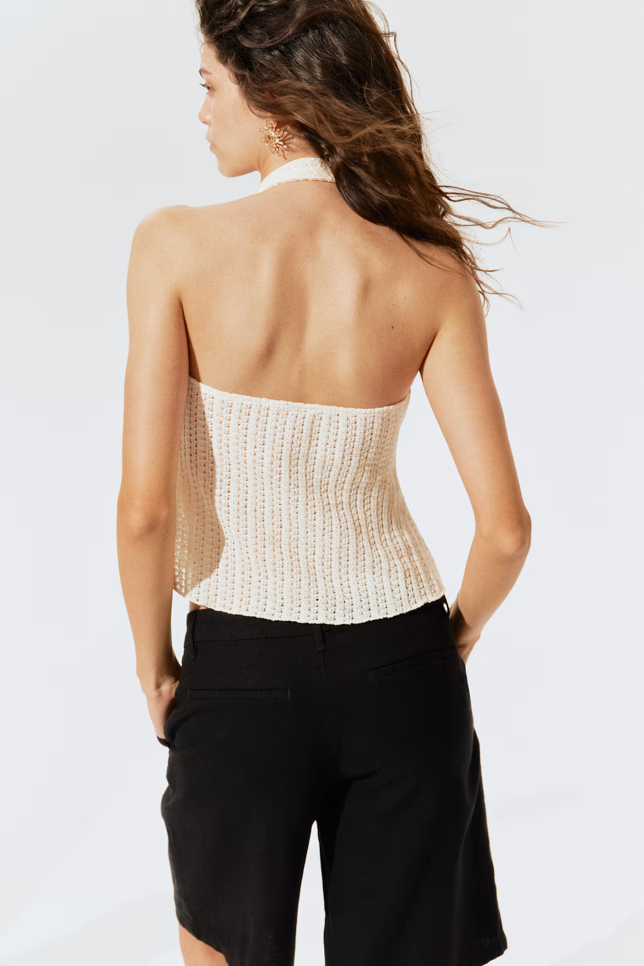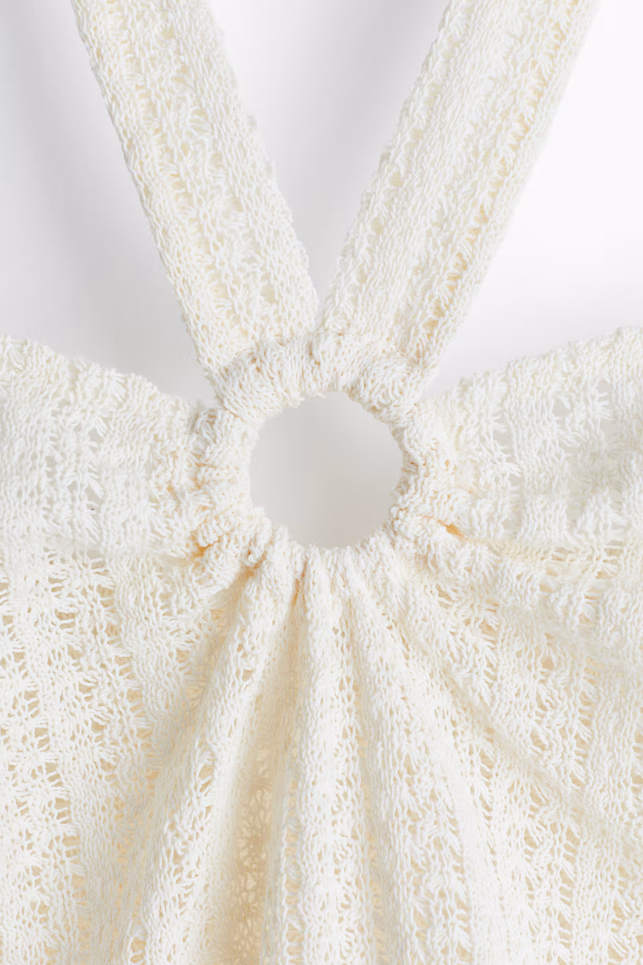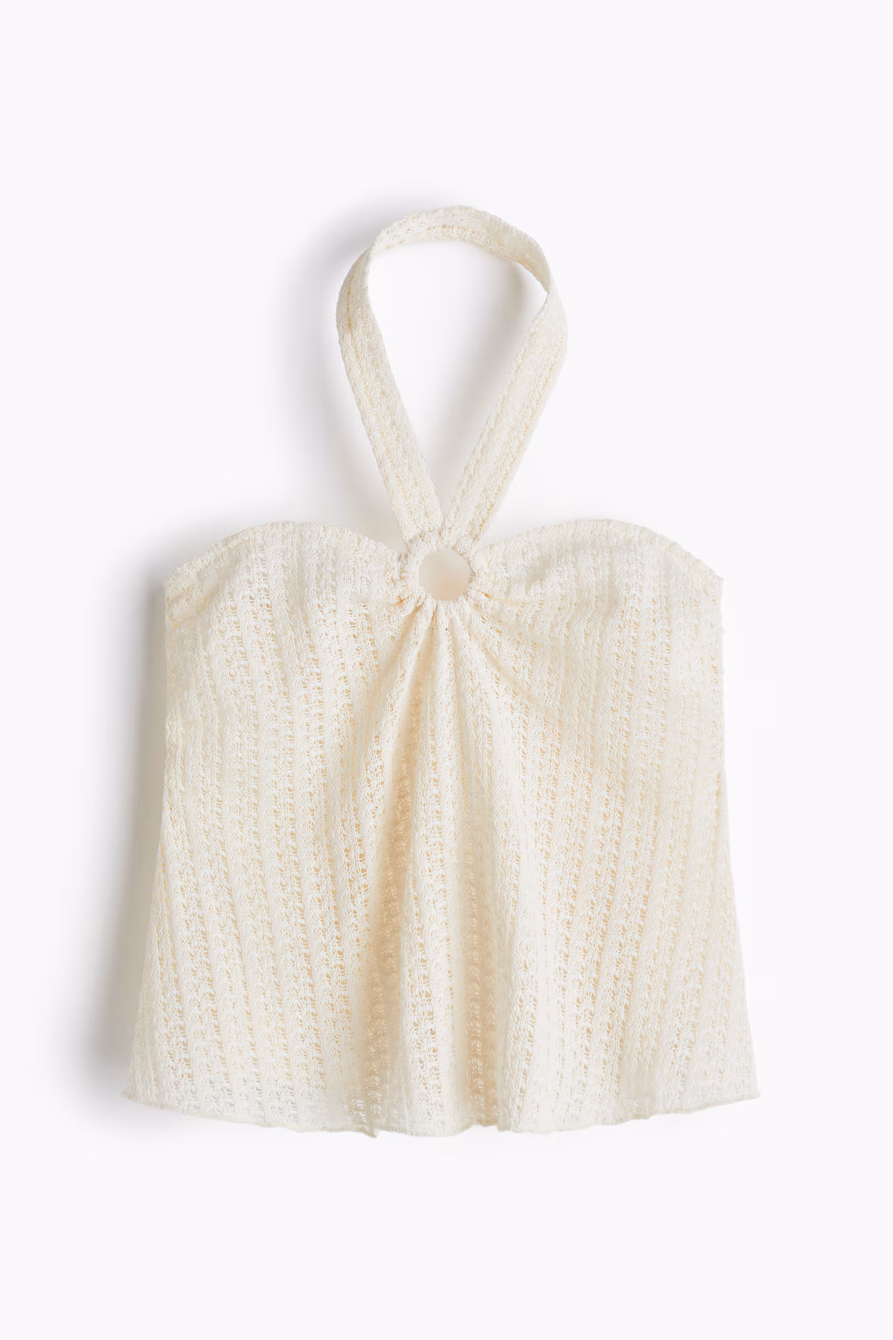 Short top in pointelle jersey. Wide halterneck tie around neck, sweetheart neckline, and a covered metal ring at center bust with gathers. Gathers at sides and gently flared hem.