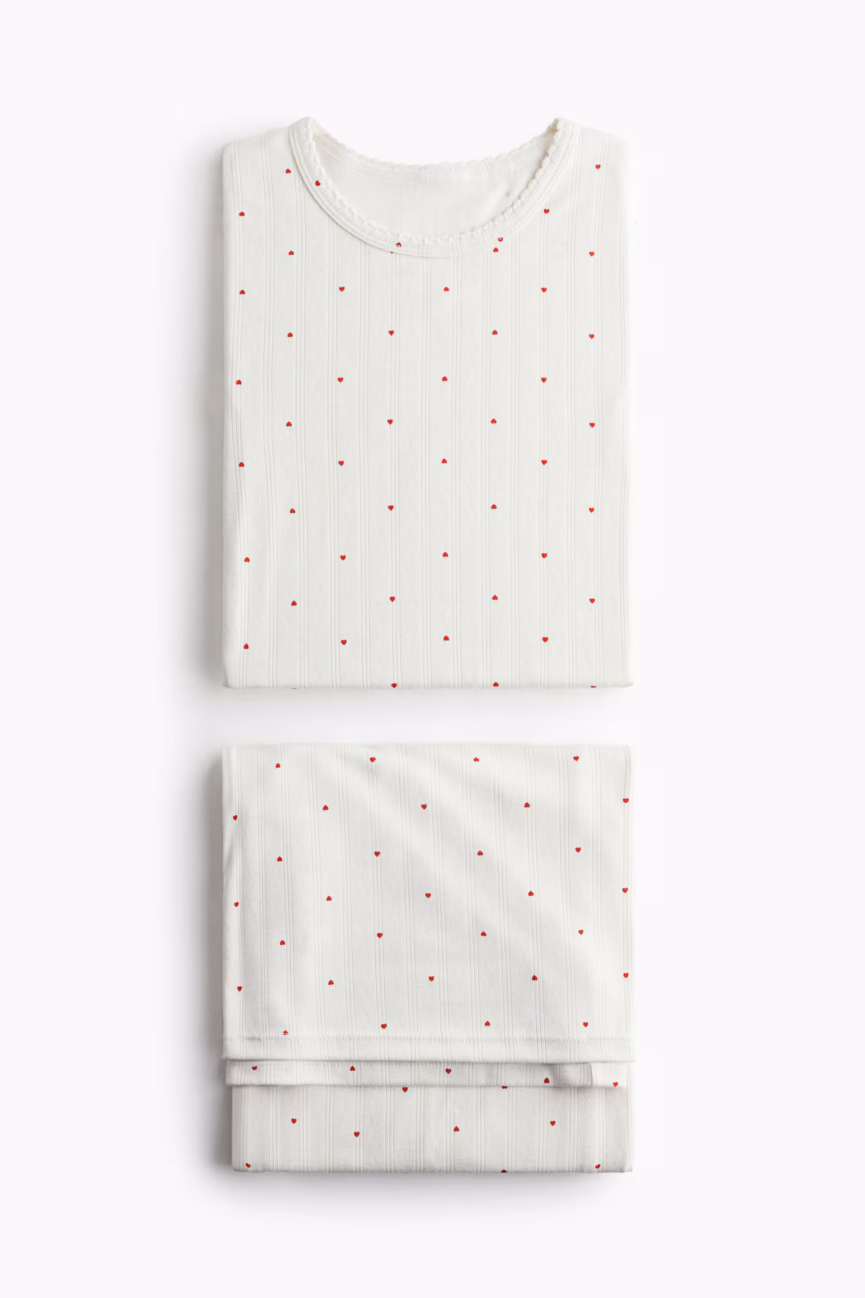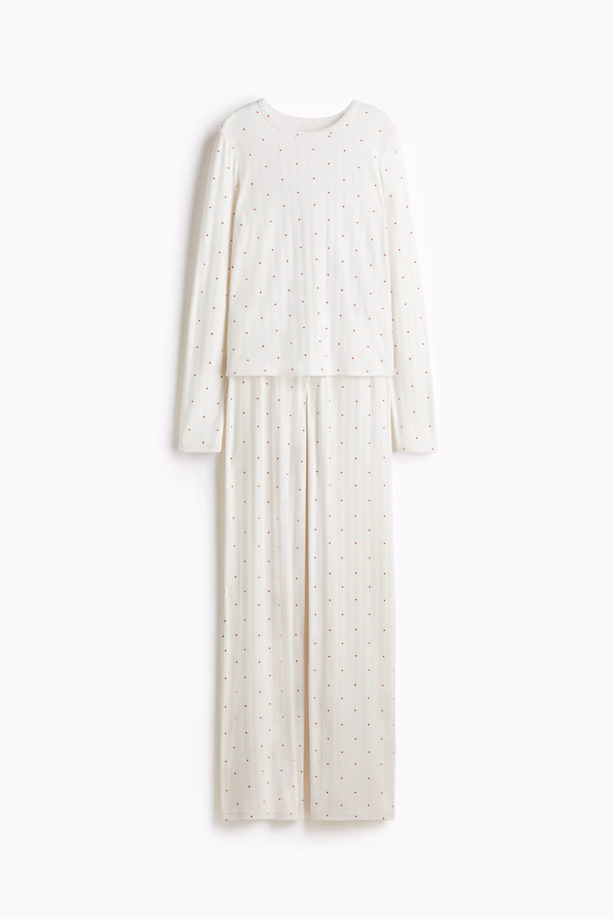 Pajamas in soft pointelle jersey with a top and pants. Long-sleeved top with a round, scalloped-edge neckline. Pants with an elasticized waistband, mock fly with decorative buttons, and wide legs.