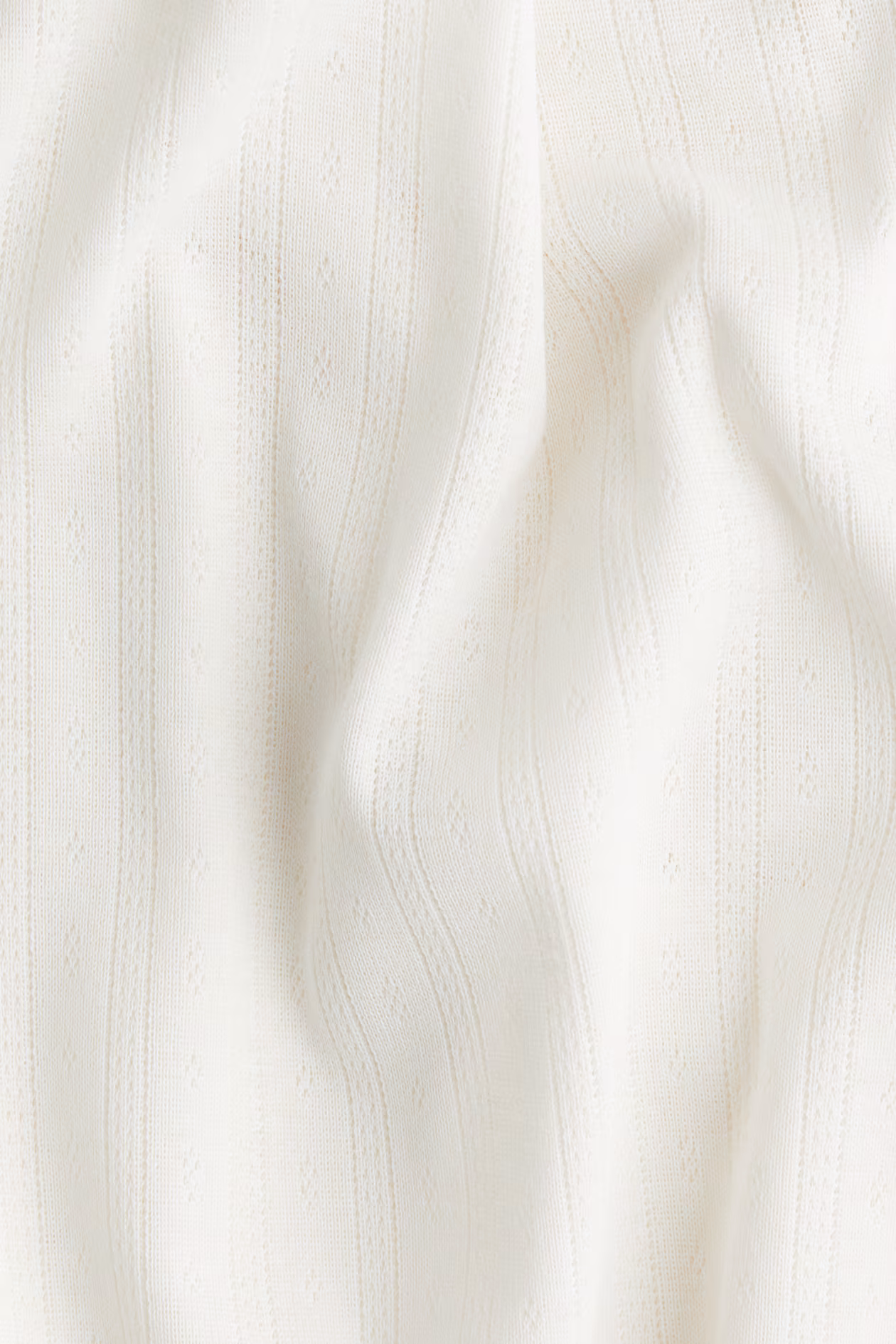 Pants in soft pointelle jersey. Low waist and elasticized picot trim at waistband with a small satin bow. Fitted upper section and wide legs.
