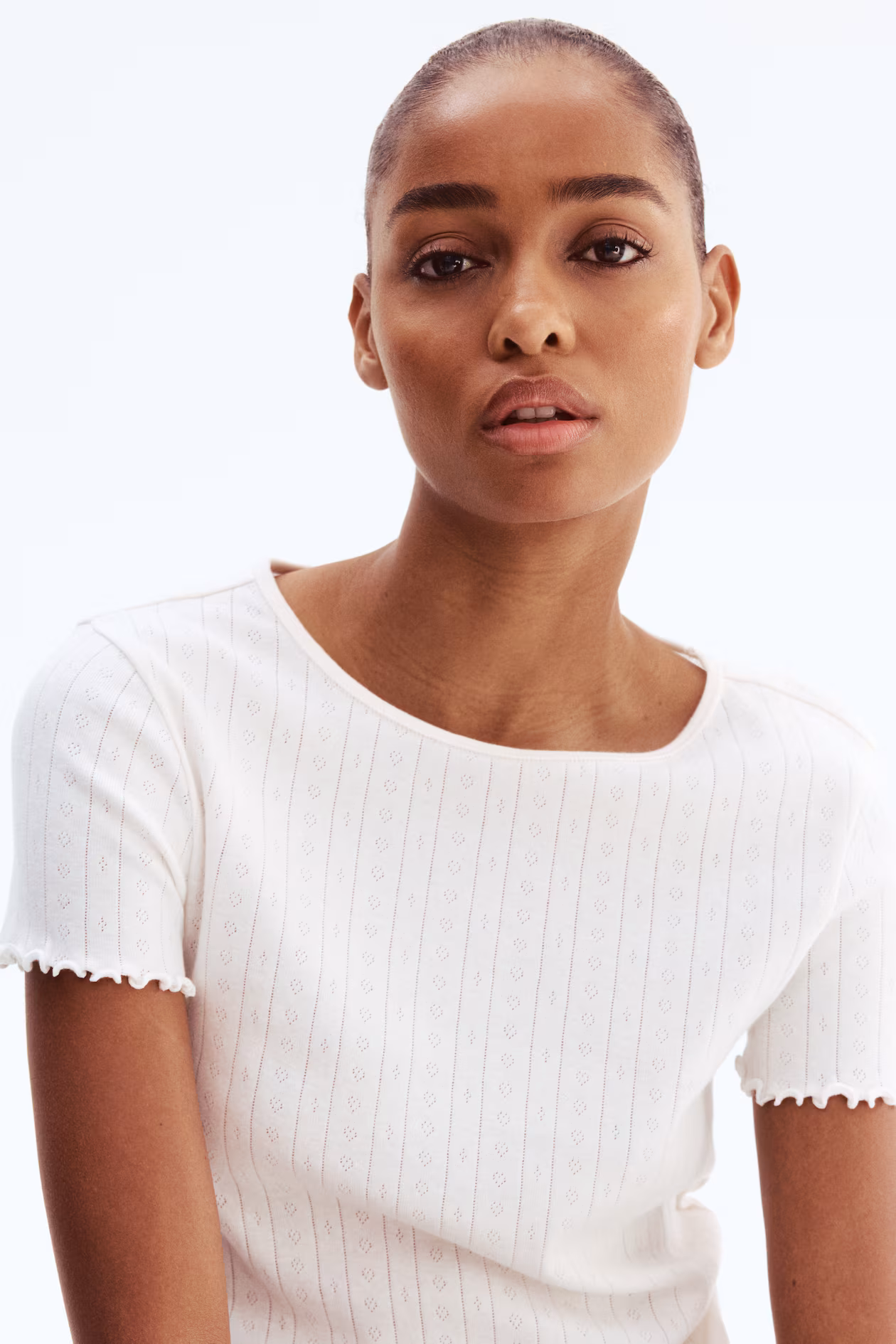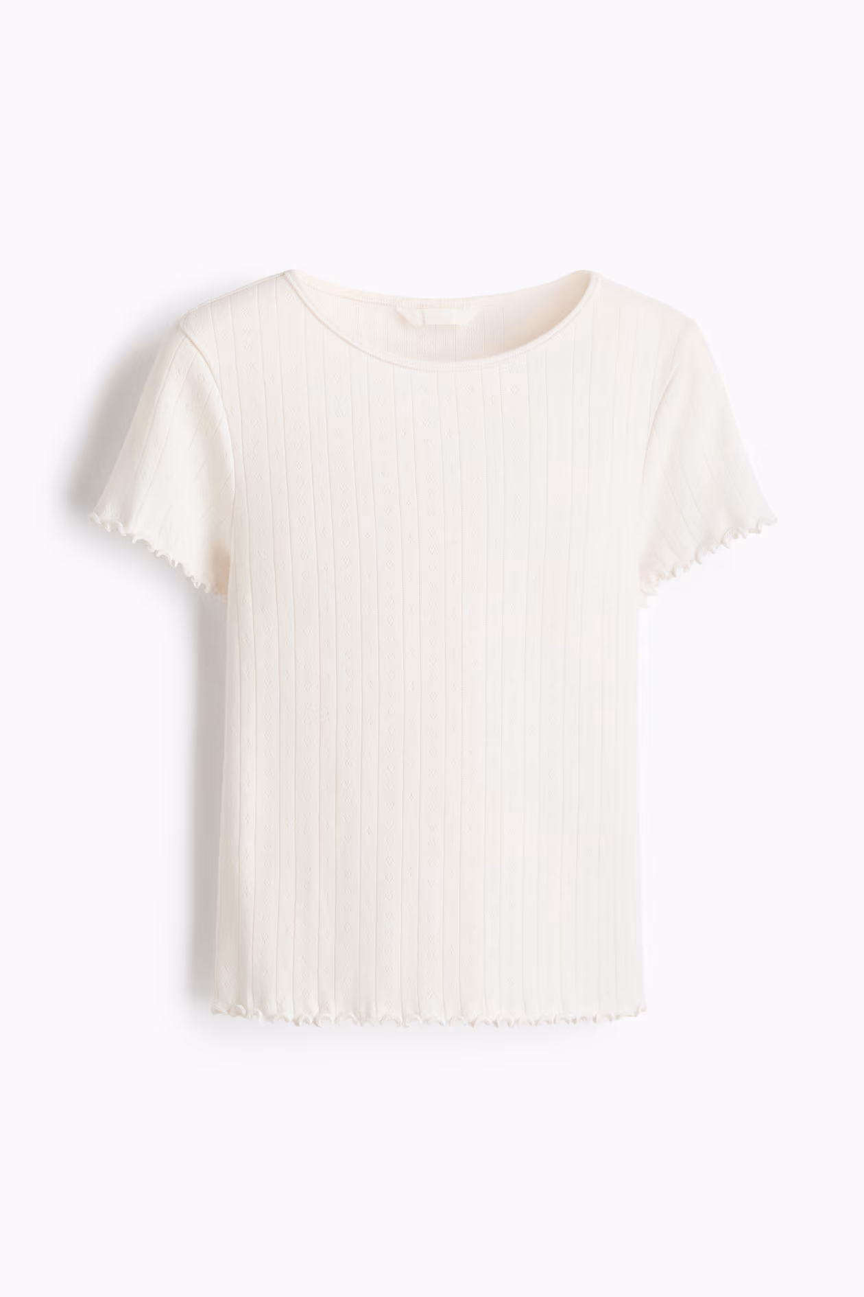 Top in soft pointelle jersey. Round neckline, short sleeves, and overlocked edge at cuffs and hem.