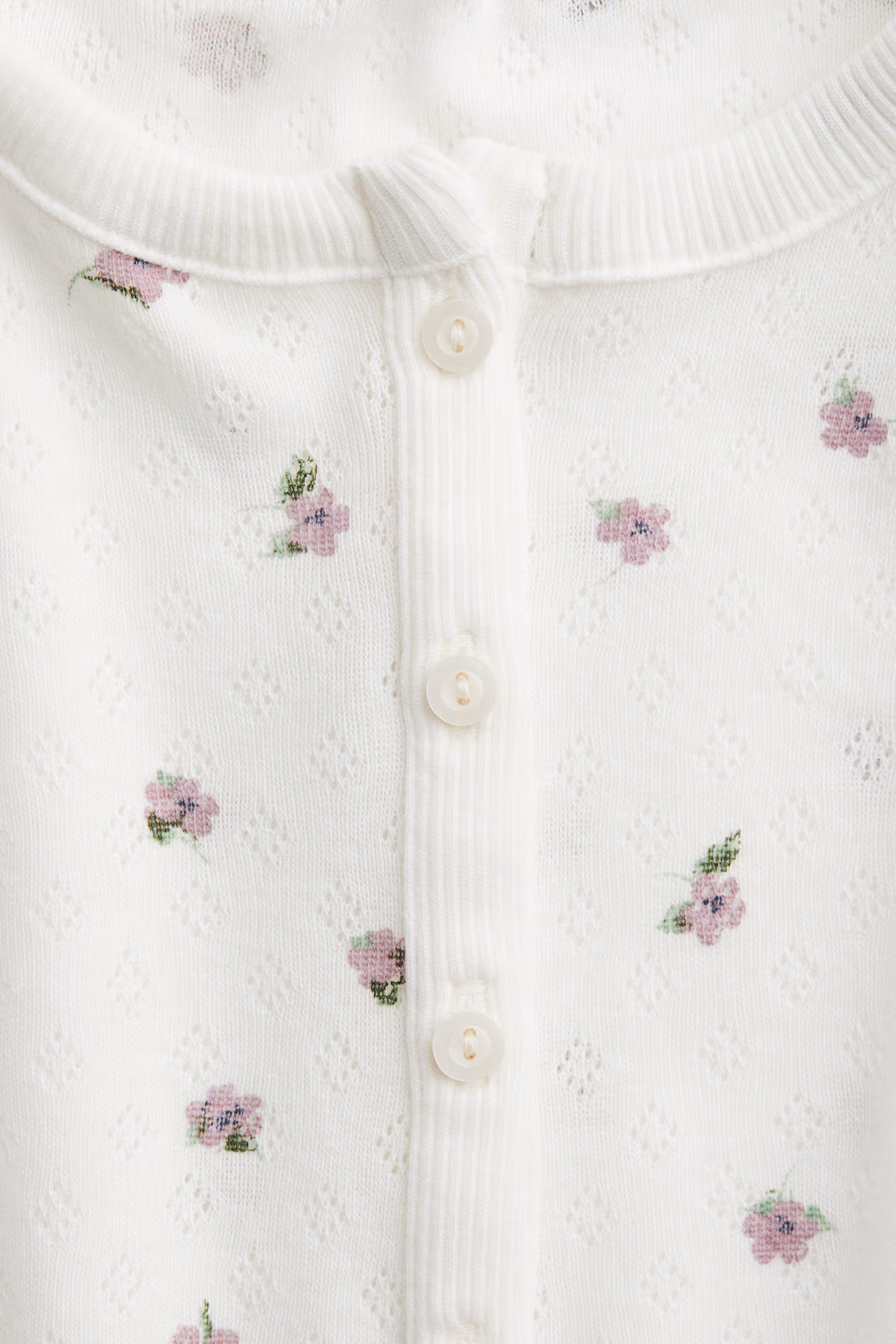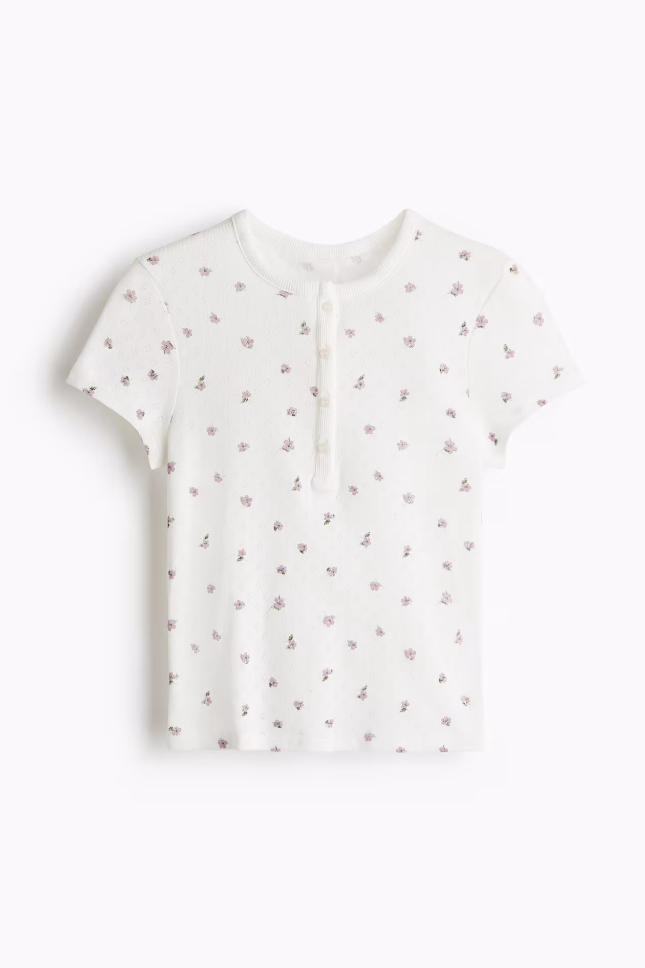 Short, fitted top in cotton pointelle jersey with a printed pattern. Round, ribbed neckline, ribbed button placket, and short sleeves.