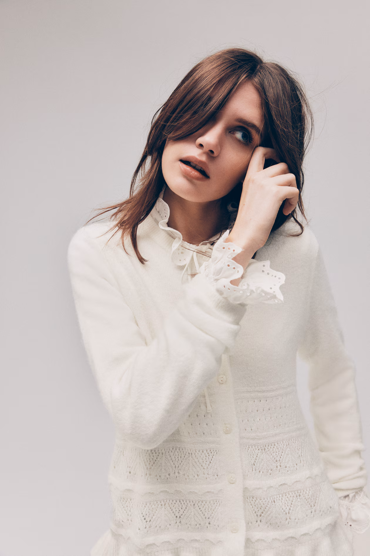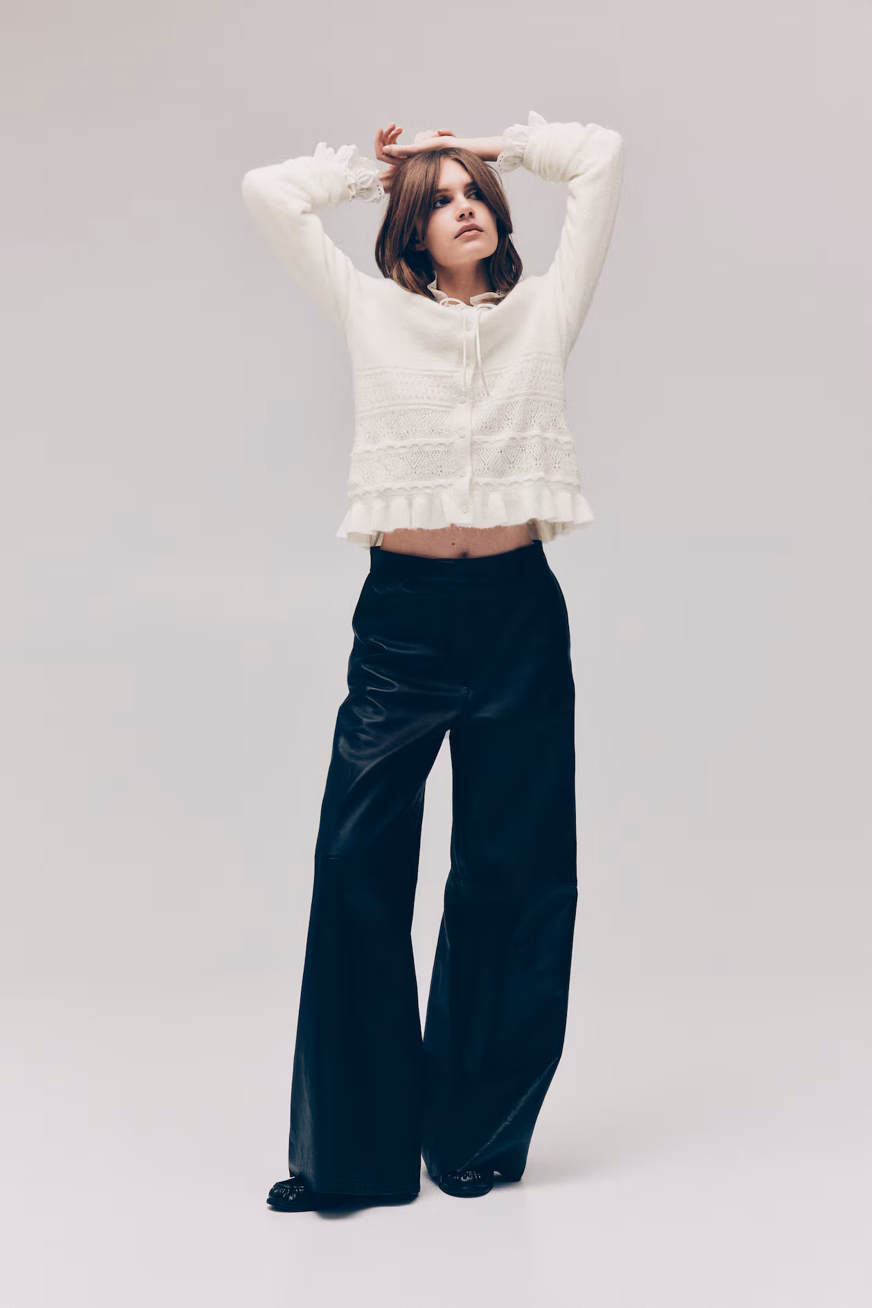 Cardigan in a soft, fine knit with pointelle-knit sections. Round neckline, buttons at front, and ruffle trim at hem.