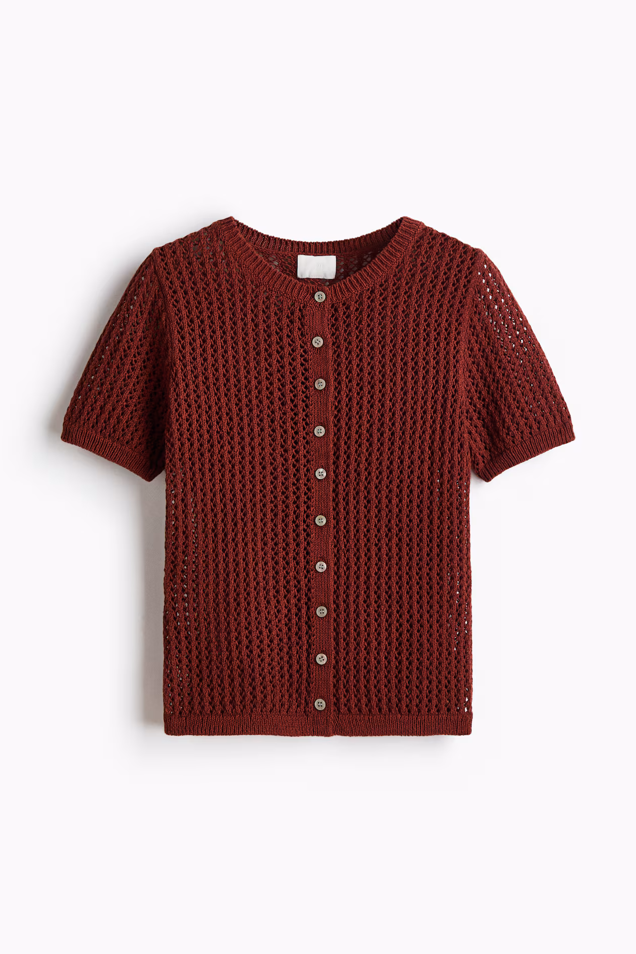 Fitted, short-sleeved cardigan in a soft pointelle knit. Round neckline, buttons at front, and ribbing at cuffs and hem.