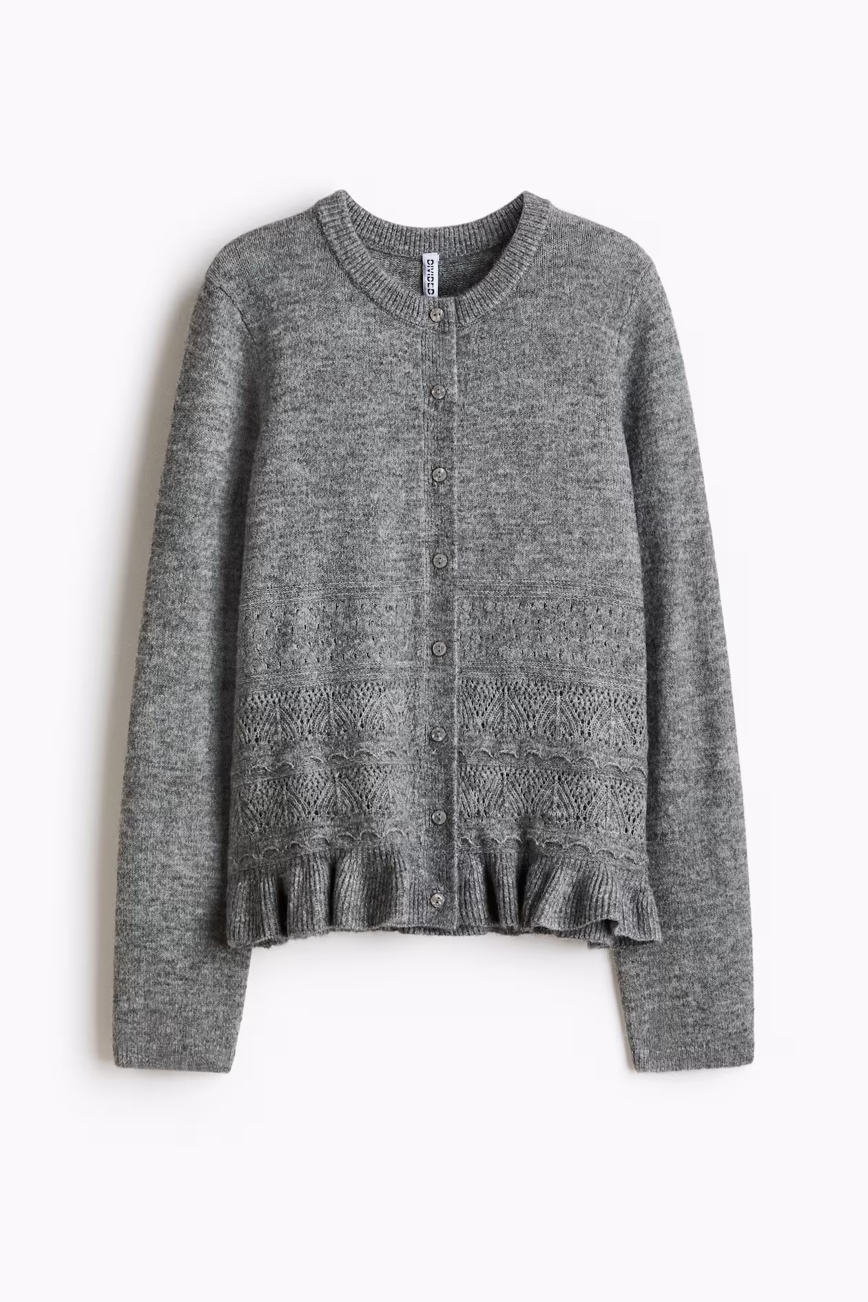 Cardigan in a soft, fine knit with pointelle-knit sections. Round neckline, buttons at front, and ruffle trim at hem.