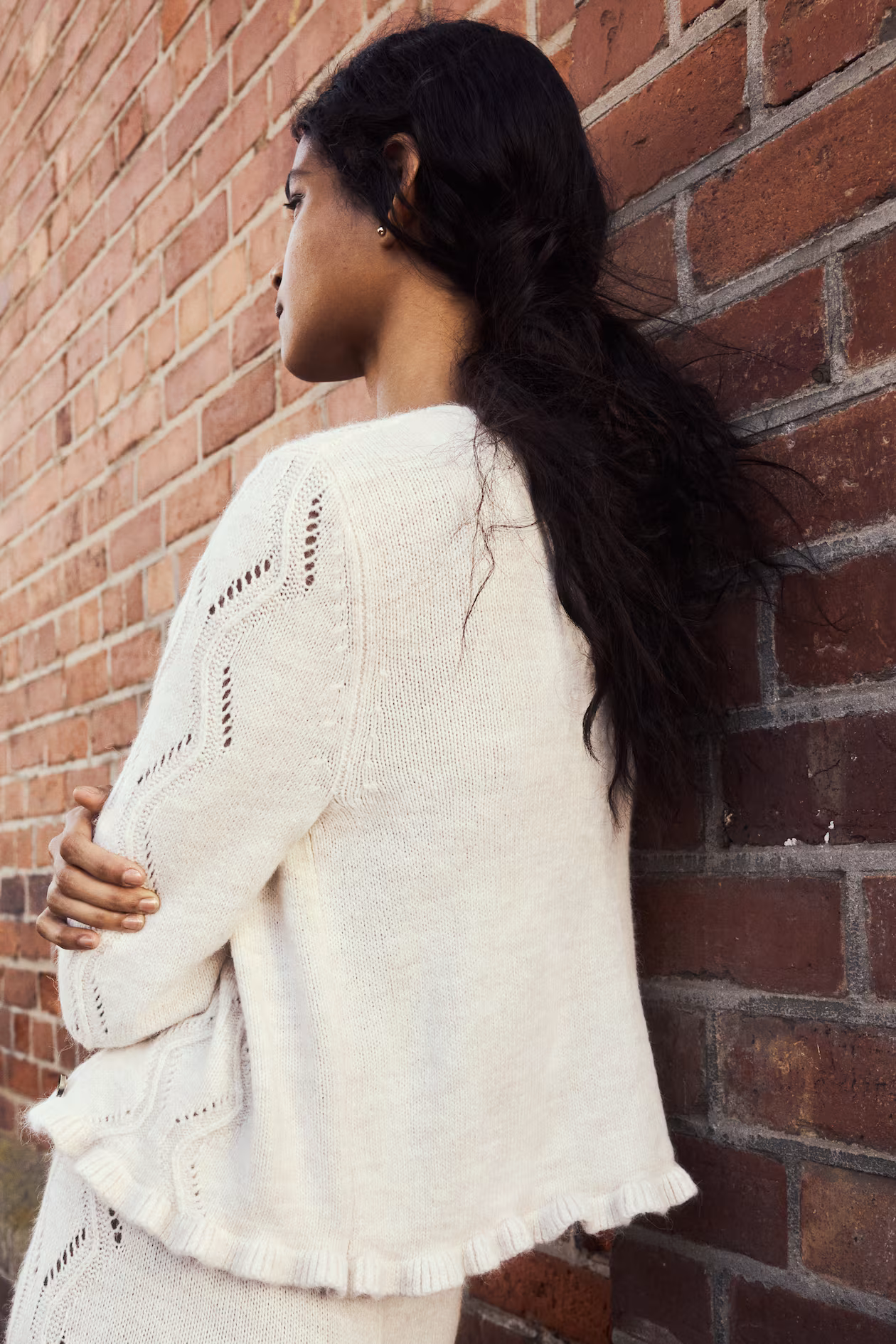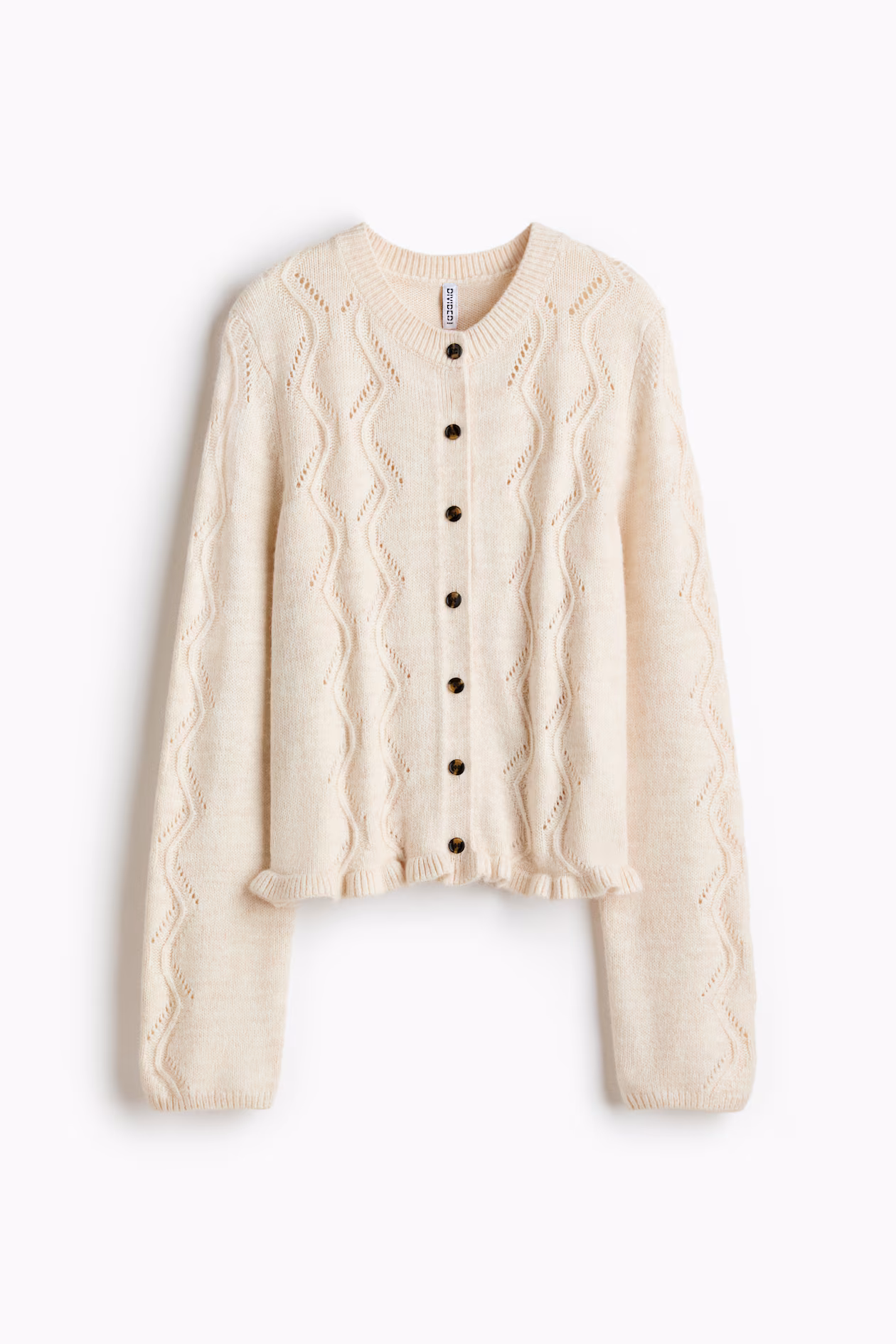 Fitted cardigan in a soft knit with pointelle-knit sections. Ribbed round neckline, buttons at front, narrow ribbing at cuffs, and ruffle trim at hem.