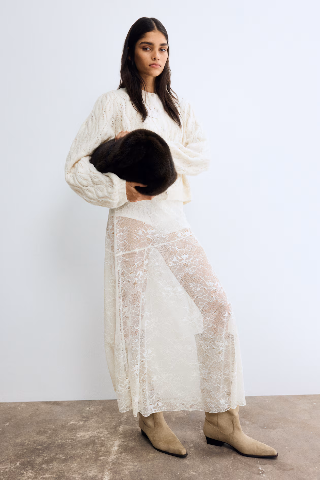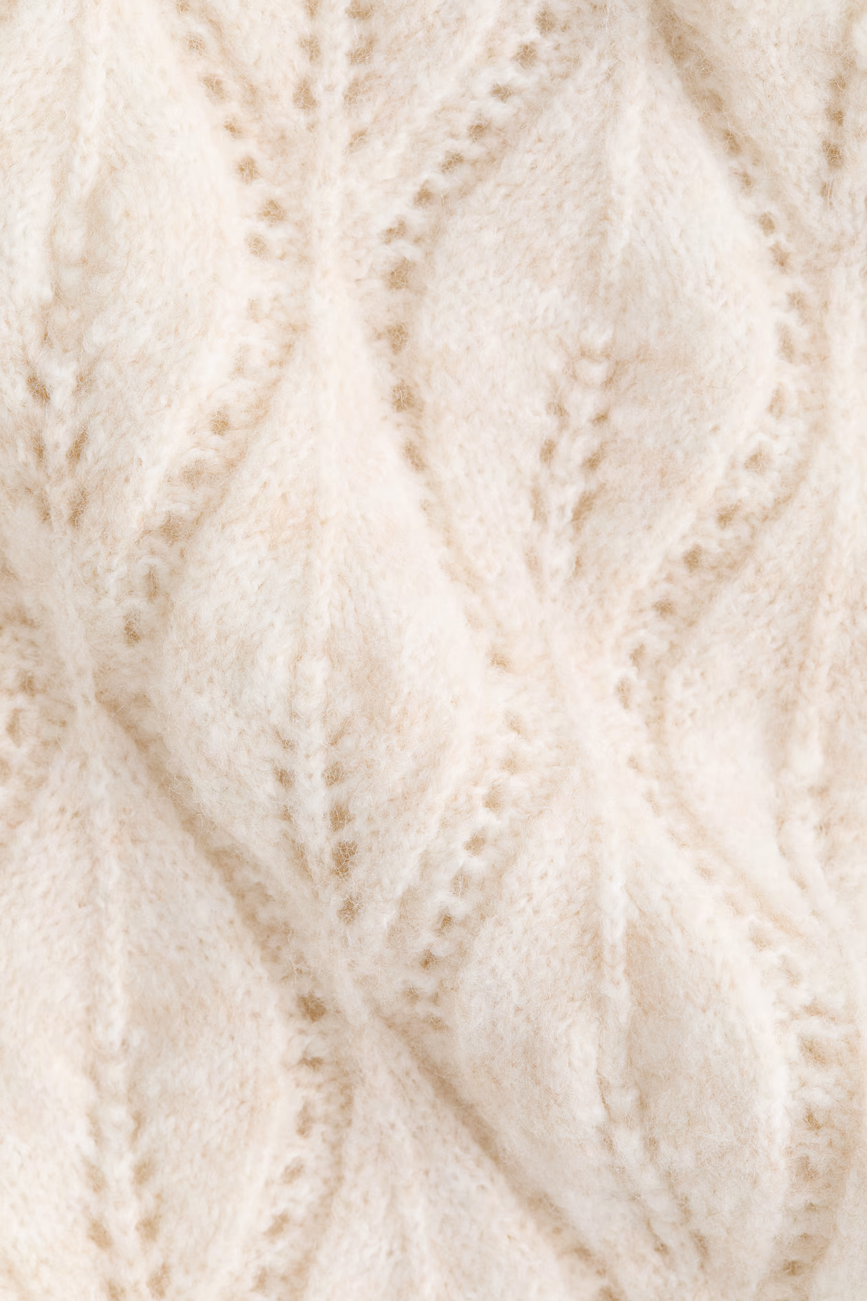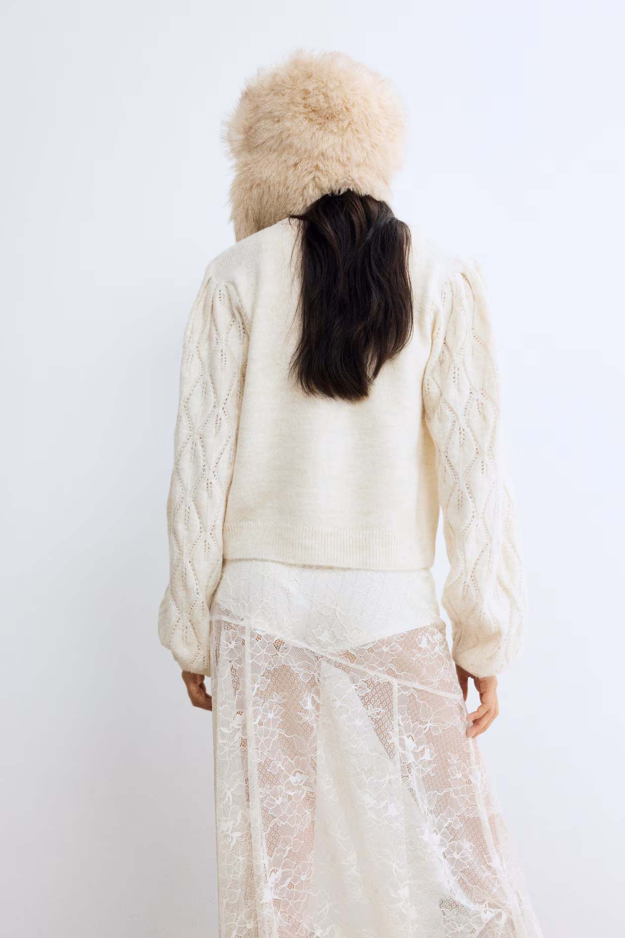 Cardigan in a soft pointelle knit. Round neckline, buttons at front, pleats on shoulders, and long sleeves. Ribbing at neckline, cuffs, and hem.