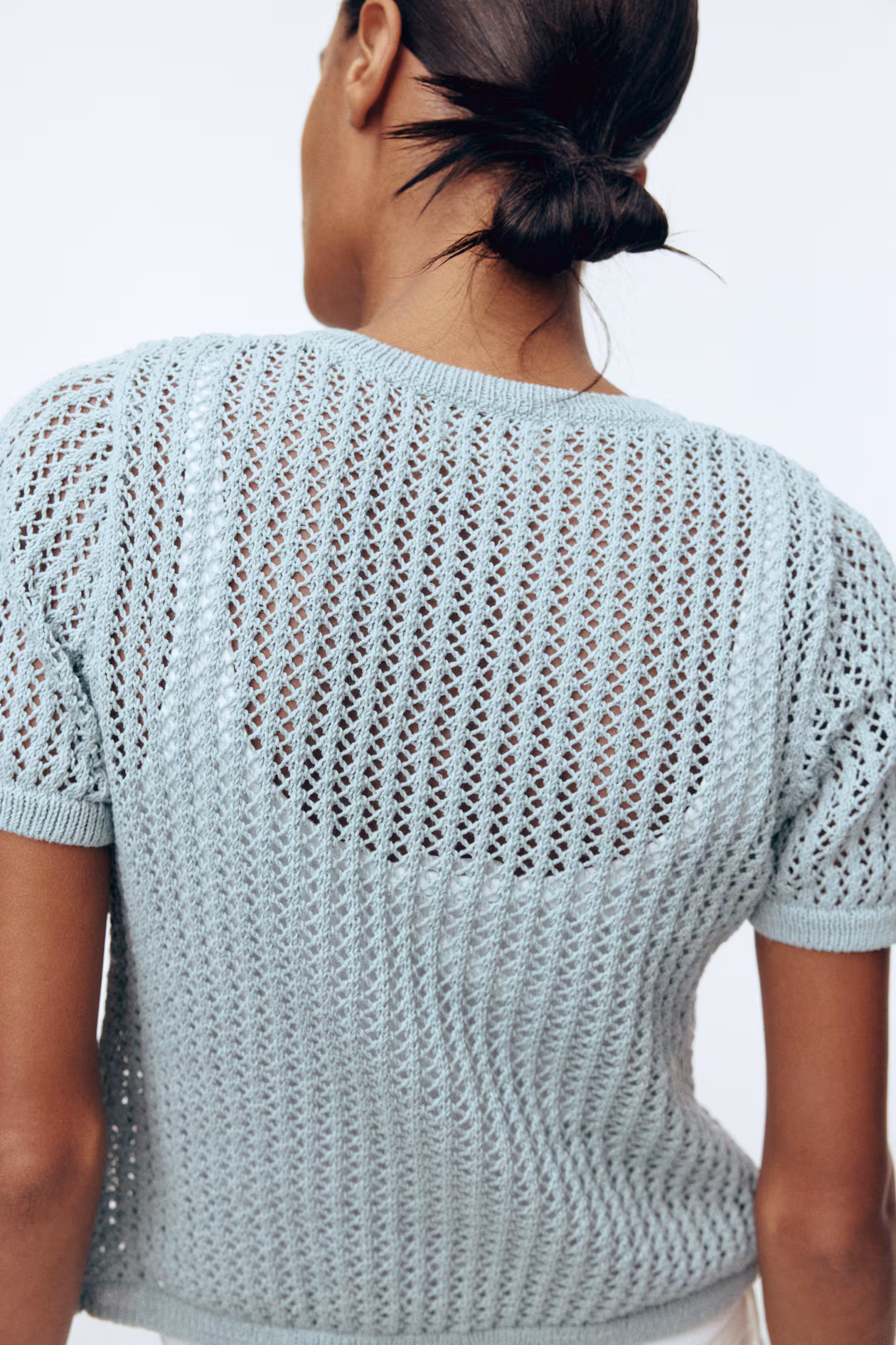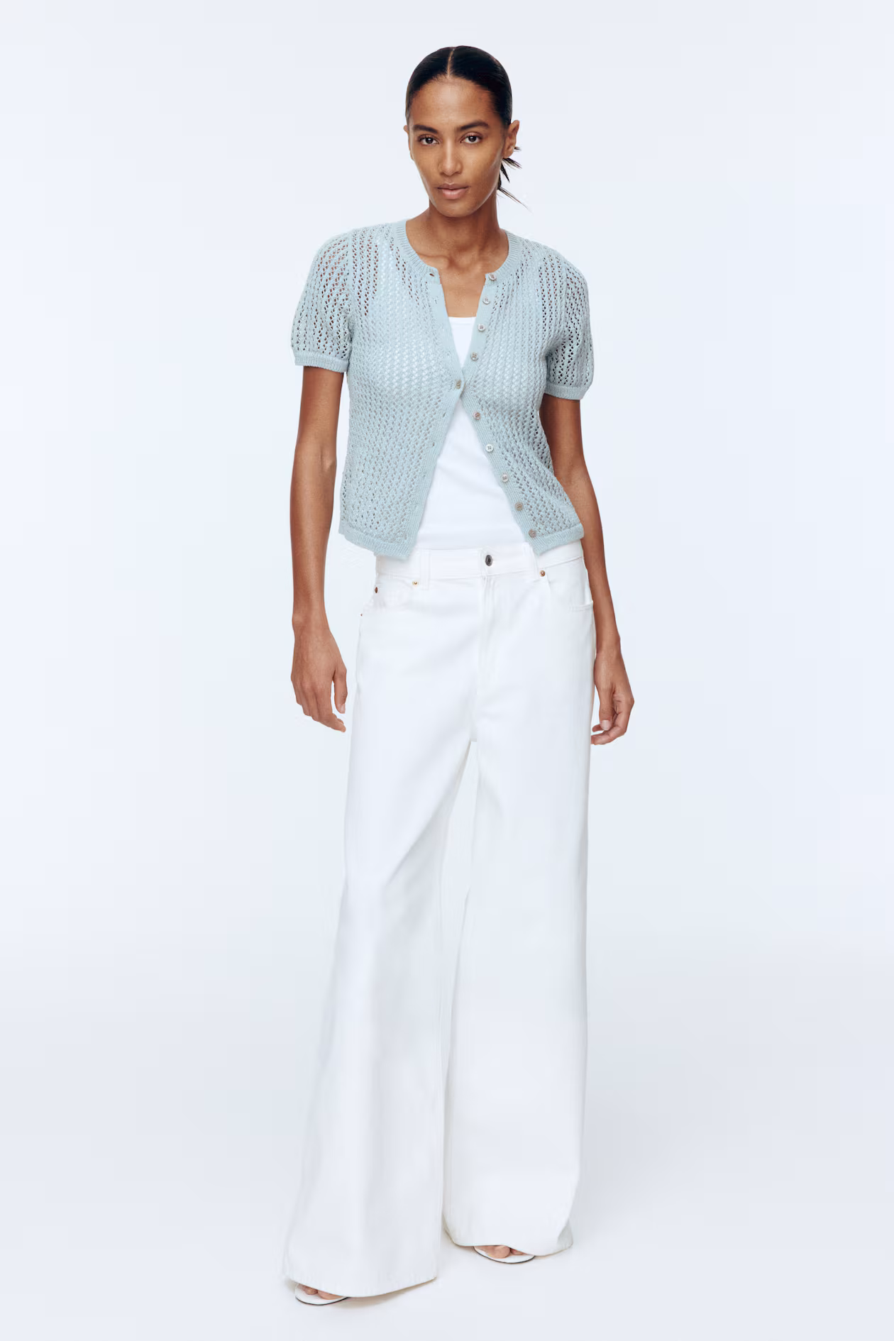 Fitted, short-sleeved cardigan in a soft pointelle knit. Round neckline, buttons at front, and ribbing at cuffs and hem.
