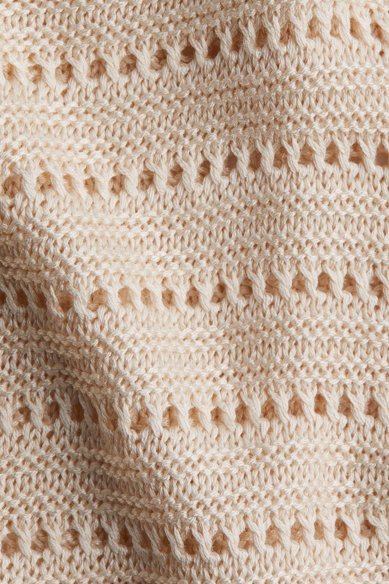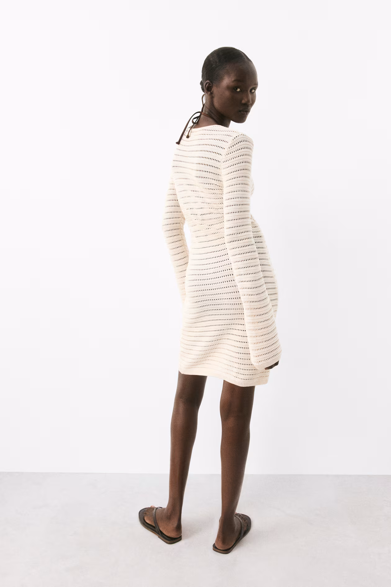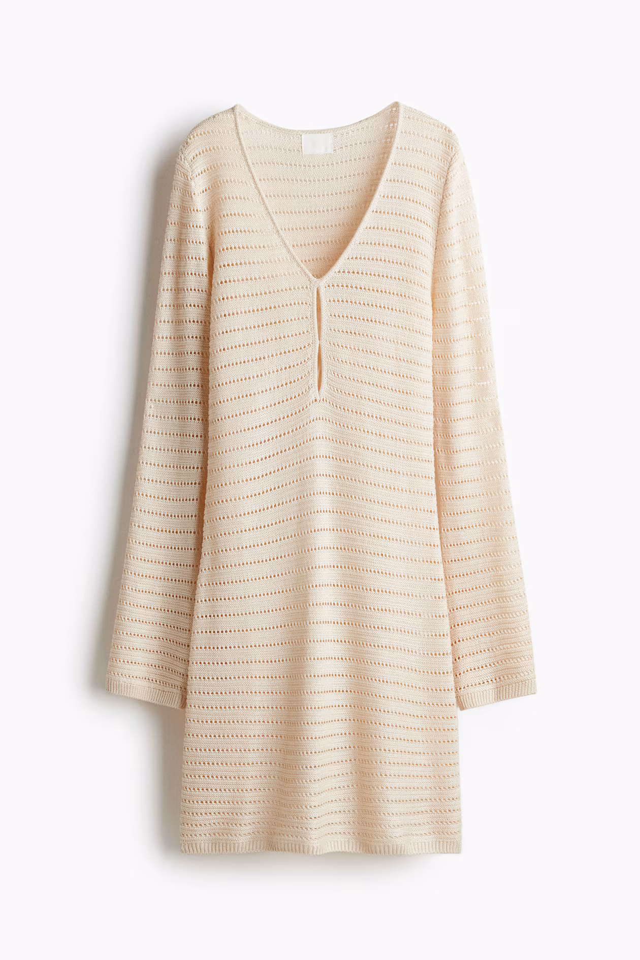 Short, fitted dress in pointelle-knit viscose. Low-cut V-neck and double keyhole opening at front, long trumpet sleeves, and narrow ribbing at cuffs and hem.