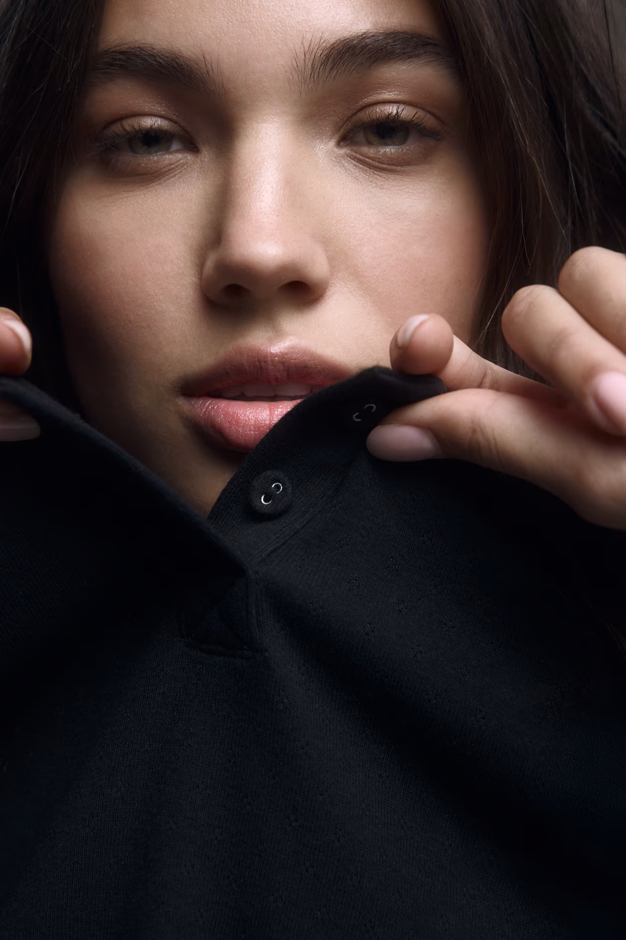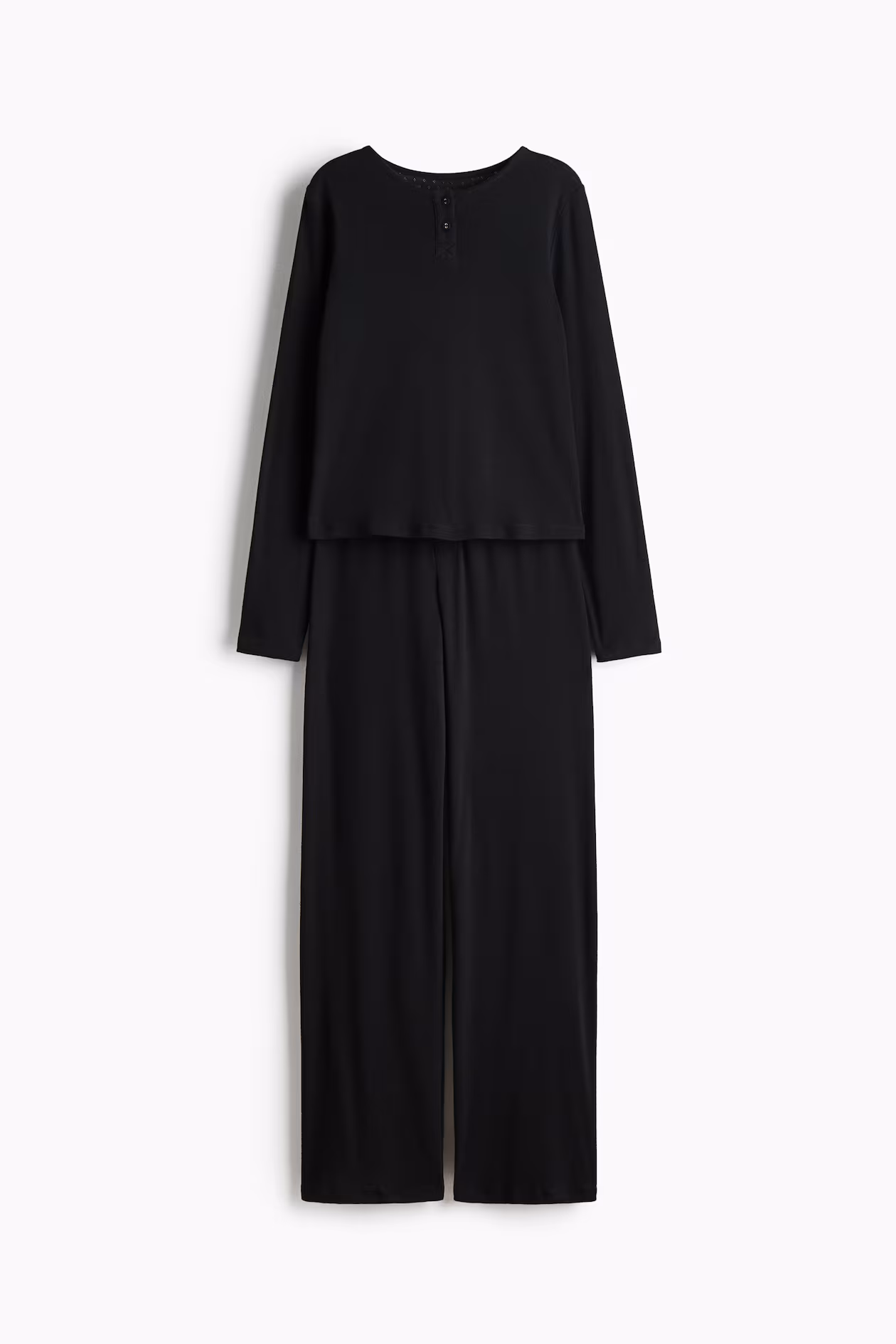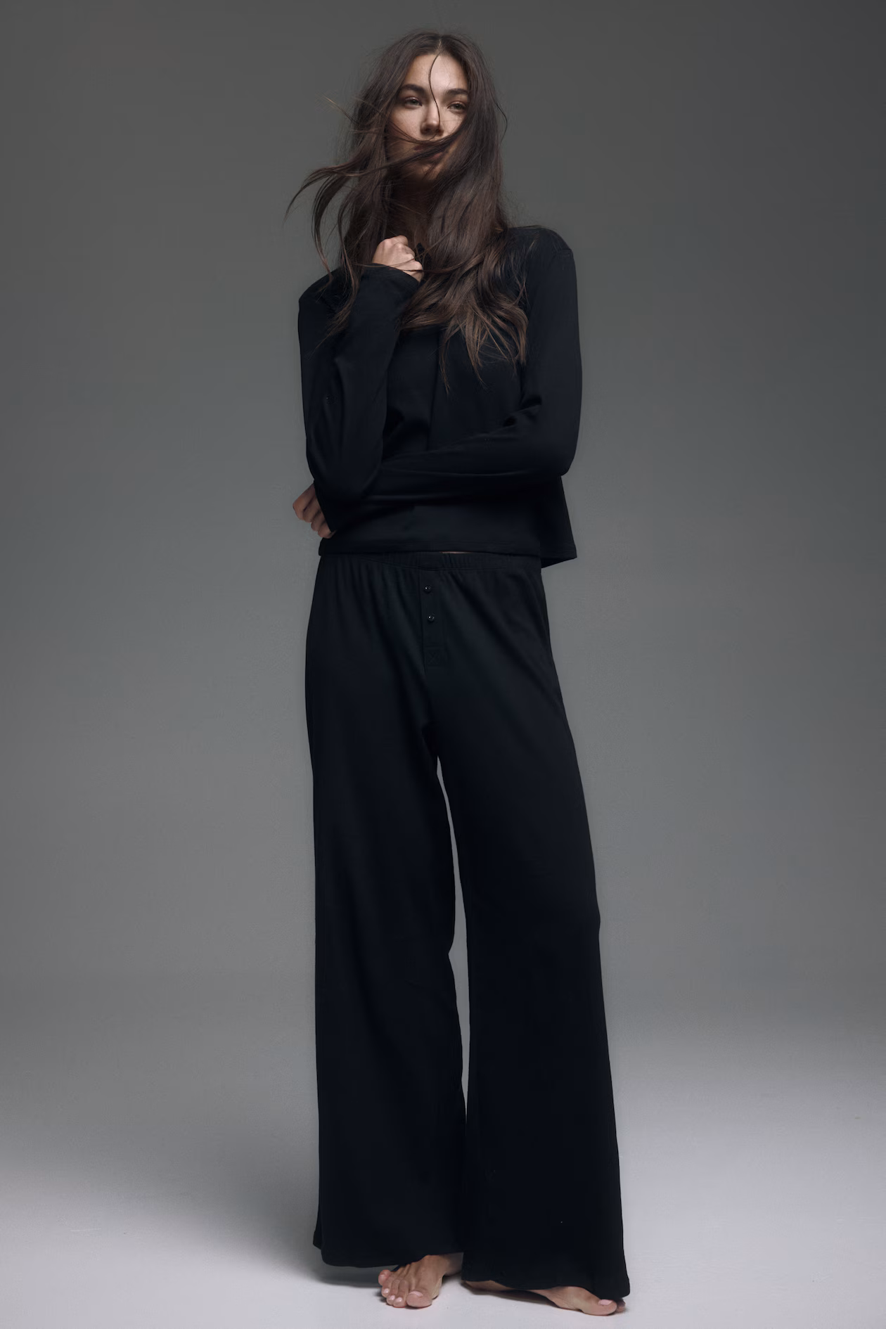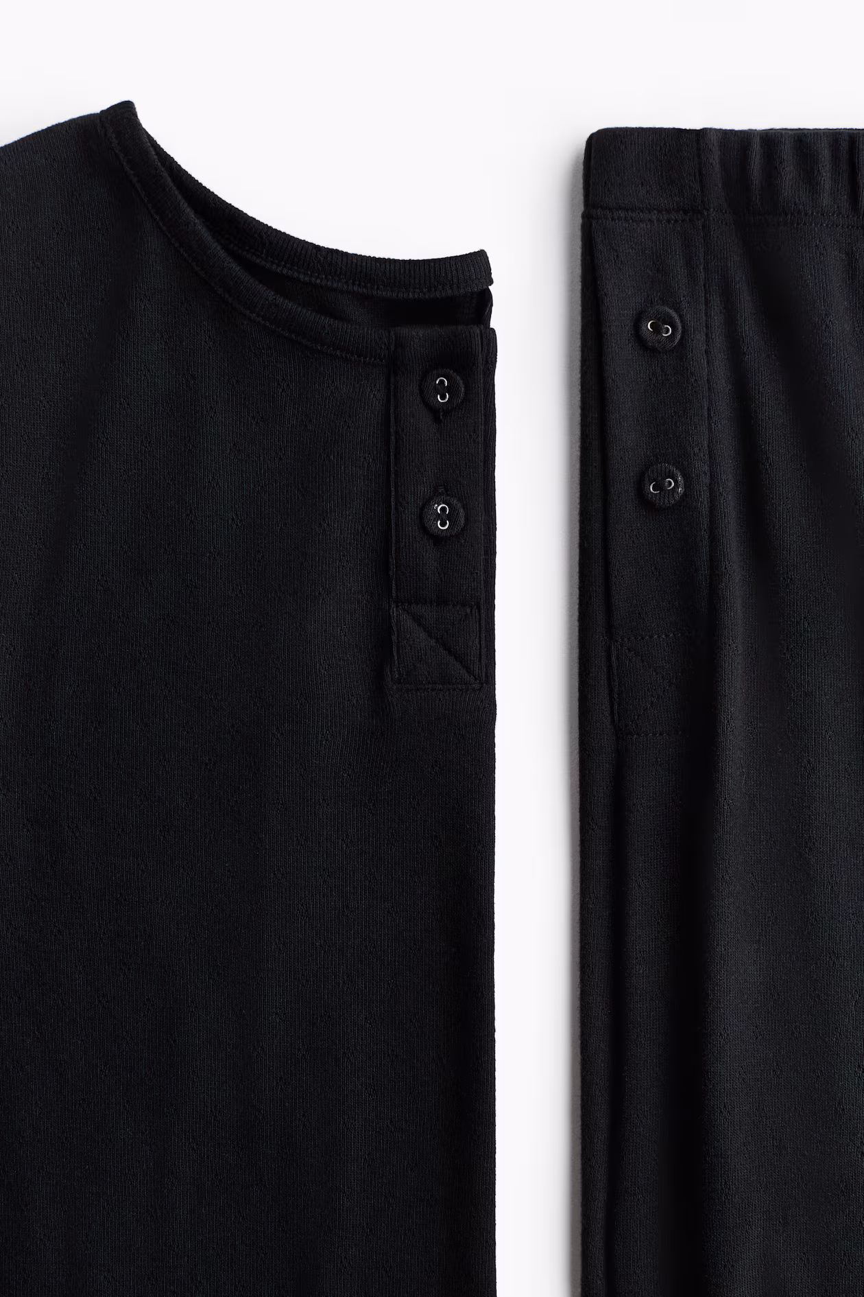 Pajamas in soft, pointelle-knit cotton jersey with a top and pants. Long-sleeved top with a round neckline and short button placket. Pants with an elasticized waistband and mock button fly.