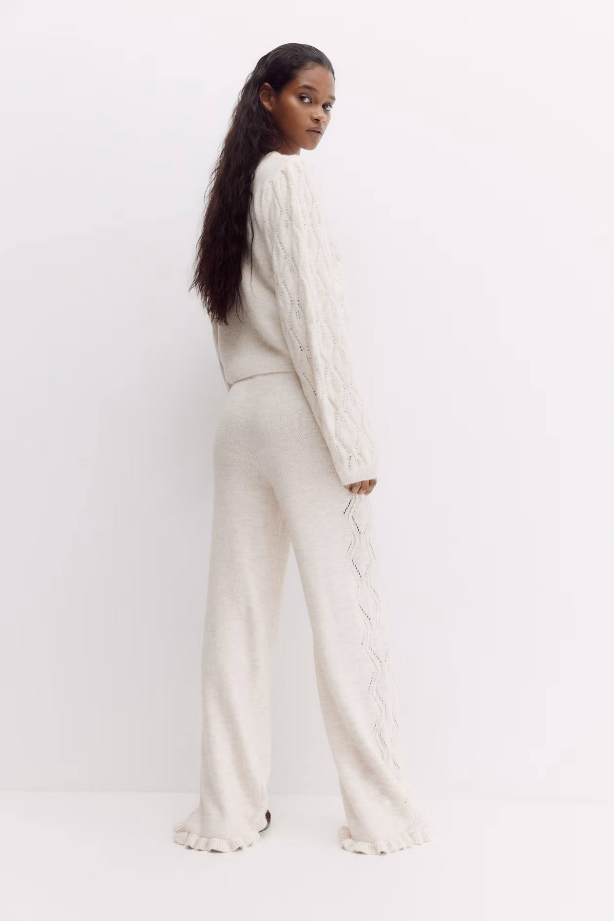 Soft, knit pants with a high waist and concealed elastic at waistband. Straight legs with pointelle-knit sections at sides and ruffle-trimmed hems.