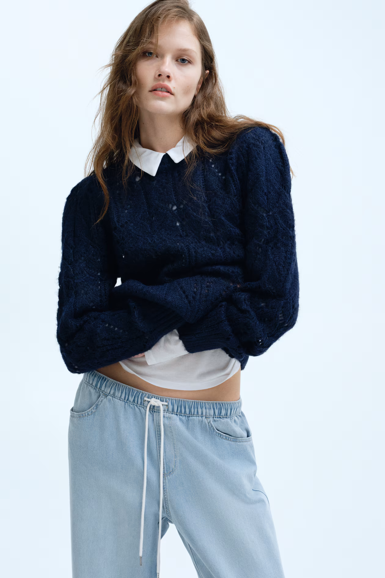 Fitted sweater in a pointelle knit with wool content. Round, scalloped-edge neckline and ribbing at cuffs and hem.