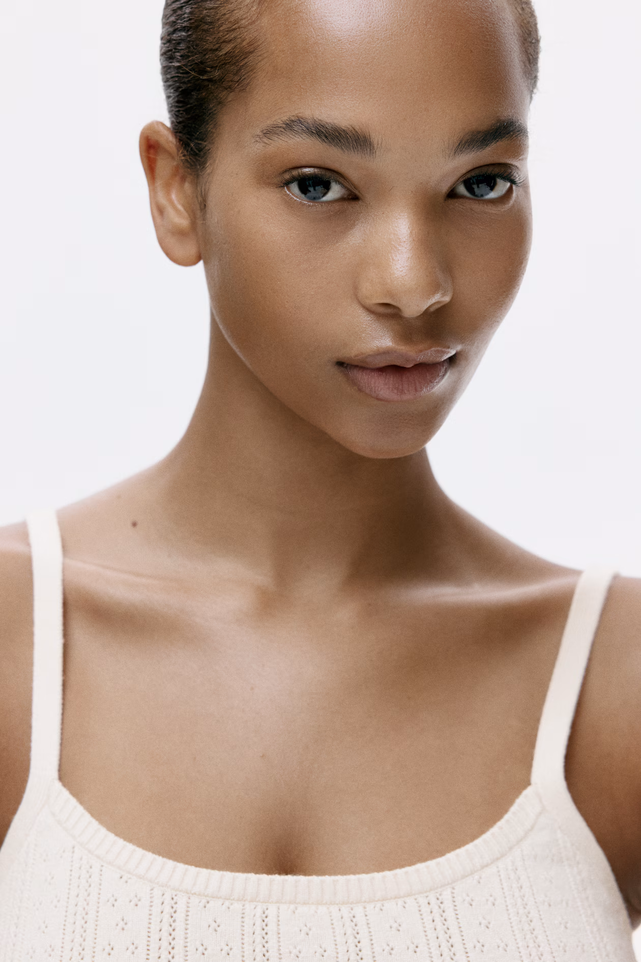 Short, fitted strappy top in a pointelle-knit viscose blend. Ribbed scoop neck.