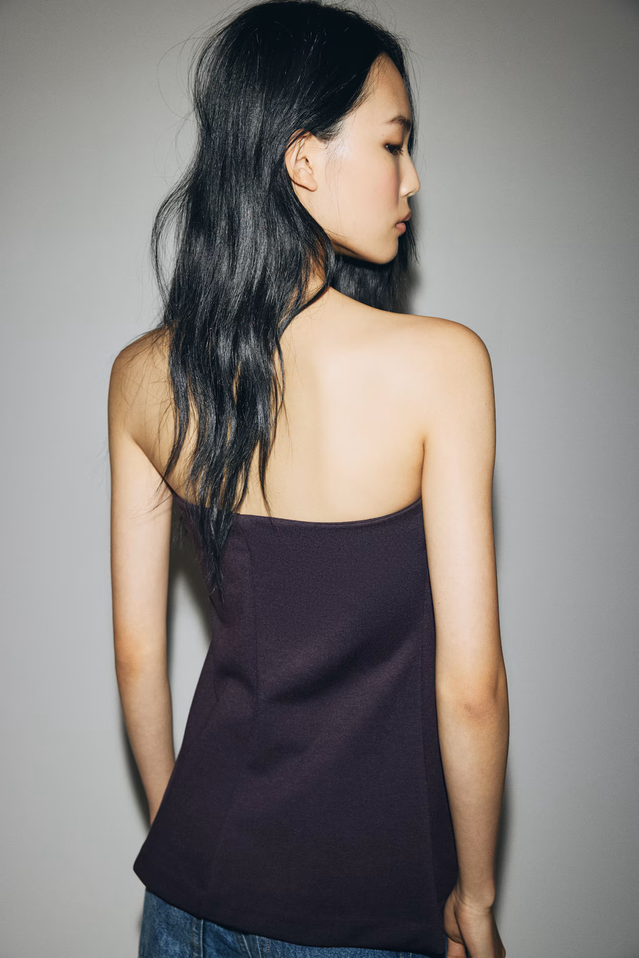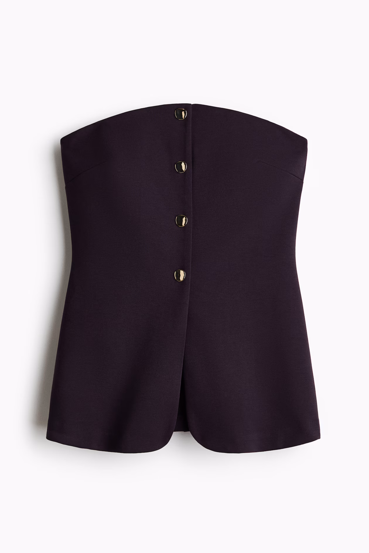 Fitted bandeau vest in ponte jersey. Buttons finishing at waist and a gently flared cut from waist to hem.