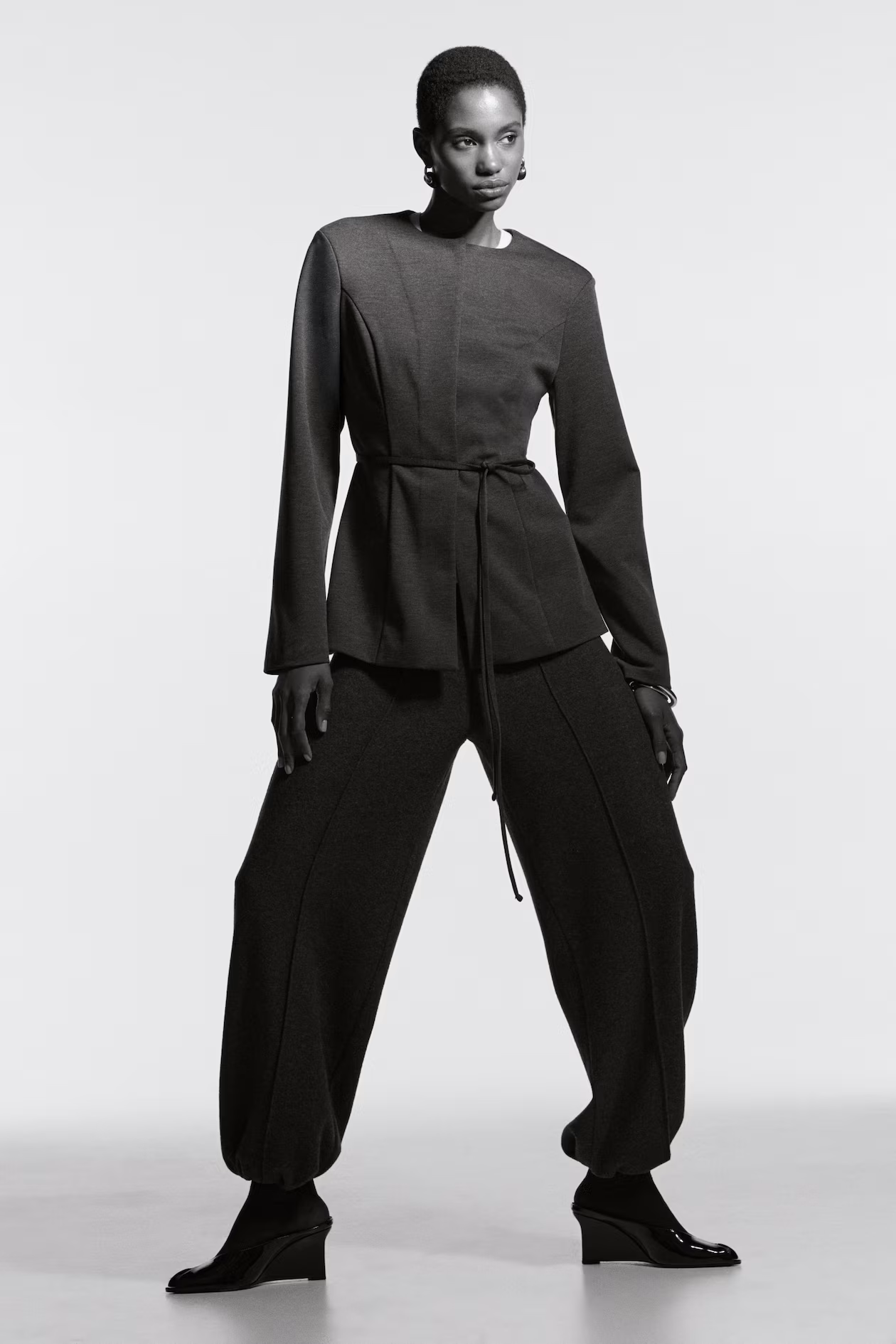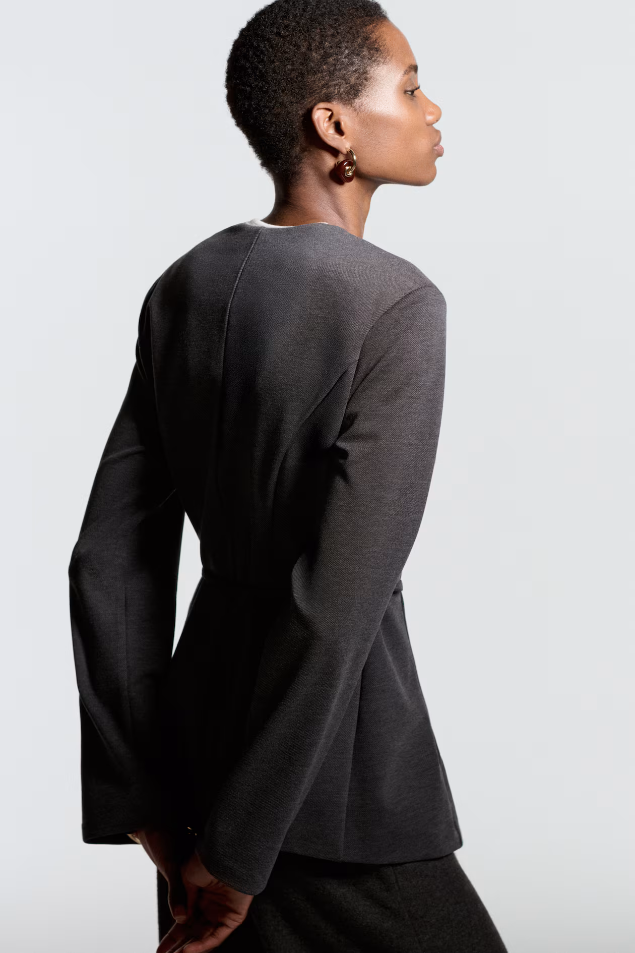 Blazer in ponte jersey with princess seams at front and back for a flattering silhouette. Round neckline, concealed snap fasteners at front, and narrow tie belt at waist. Shoulder pads. Lined.